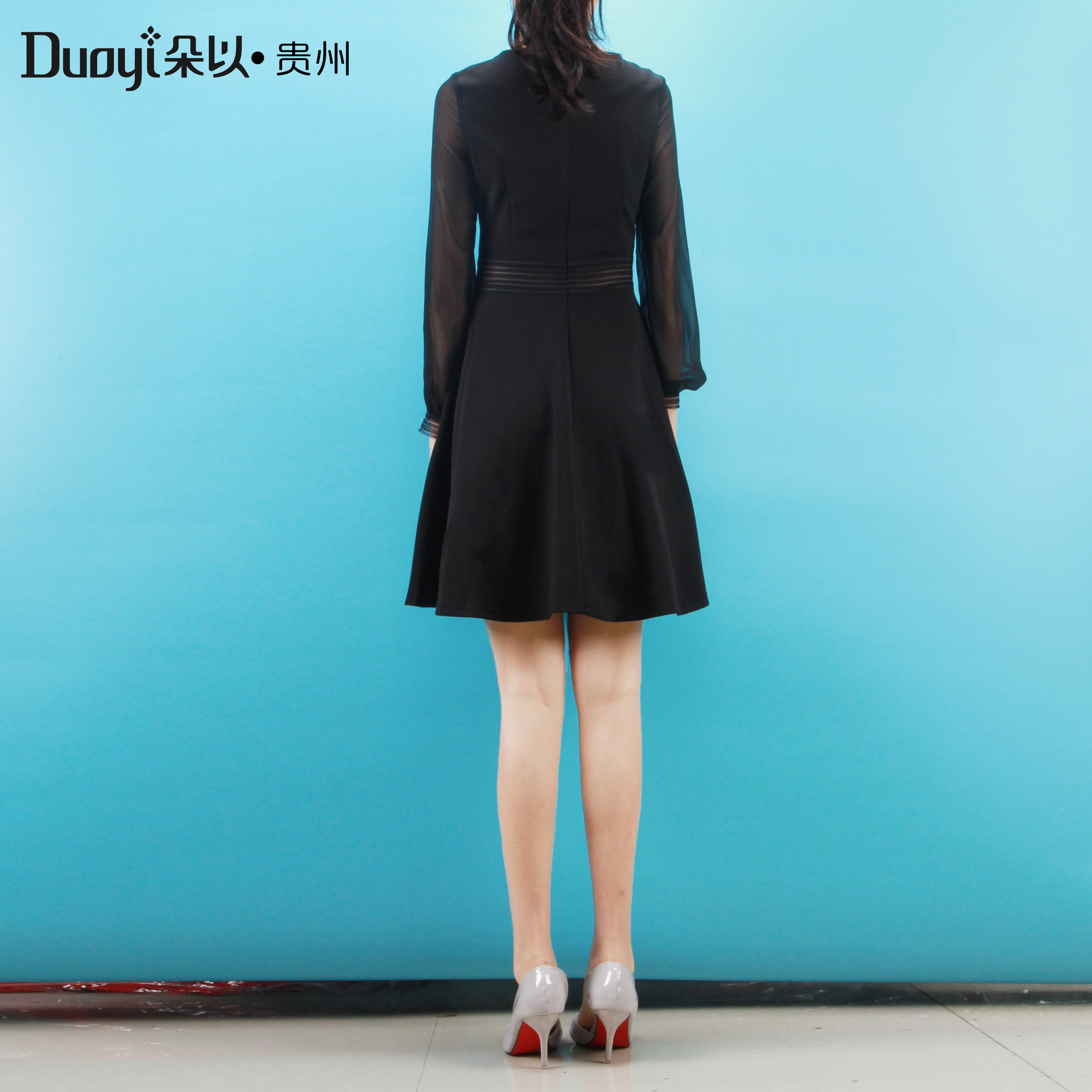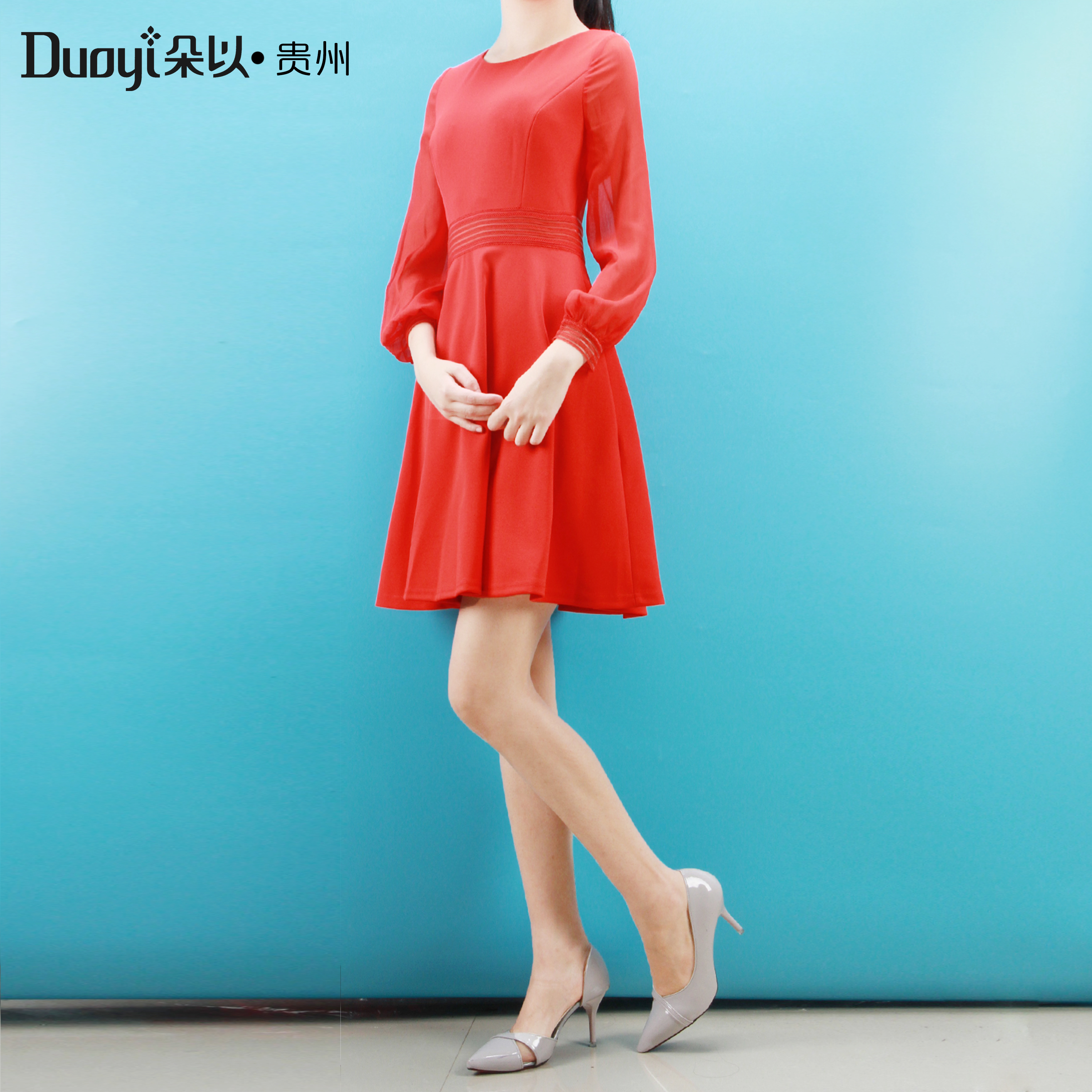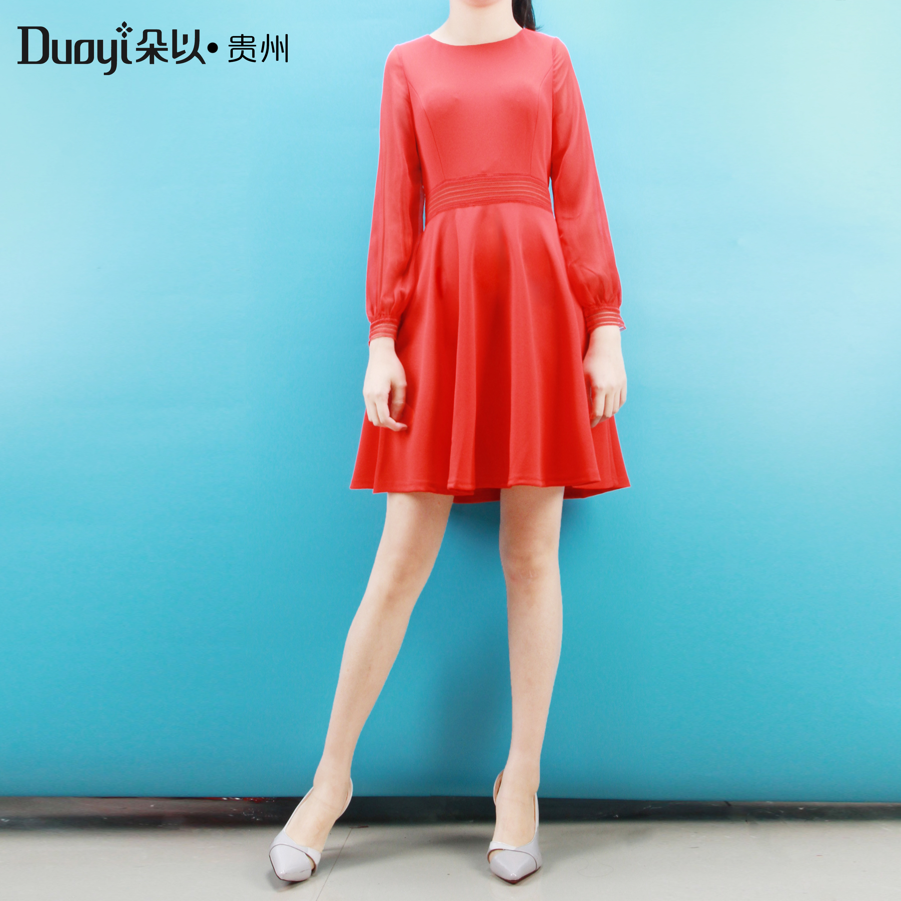 Duoyi朵以2019春装新款专柜正品气质甜美修身拼接收腰显瘦连衣裙