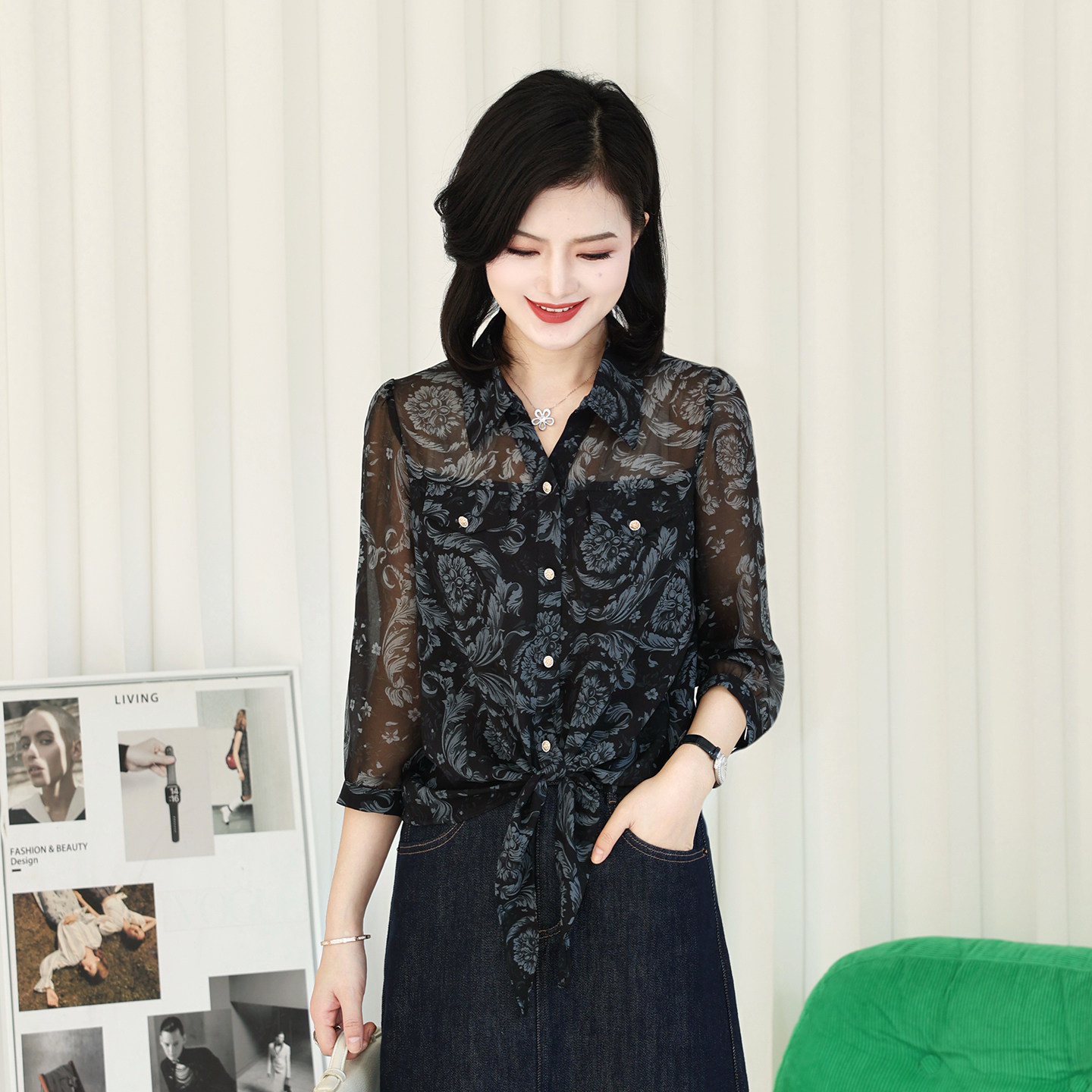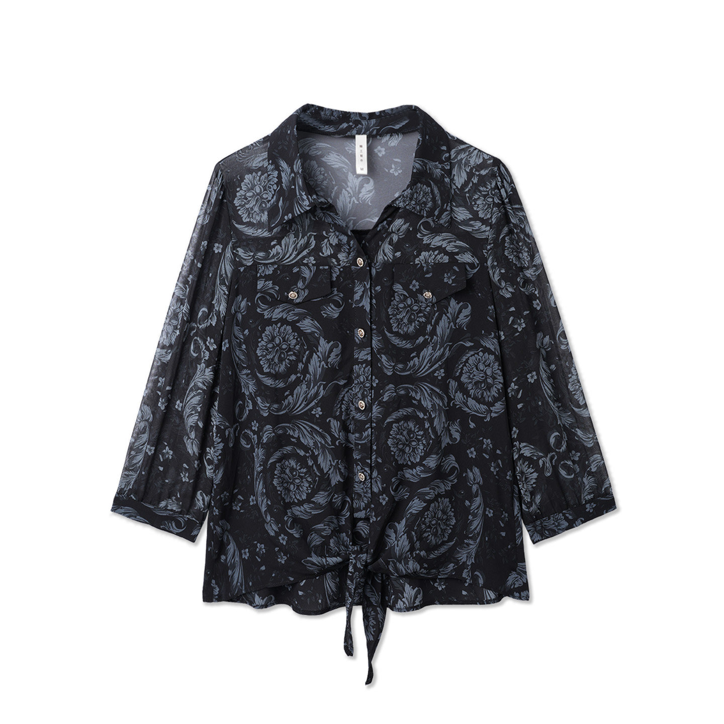 枫竺优雅通勤翻领下摆系带印花衬衫女2026春季新款层次感气质衬衣