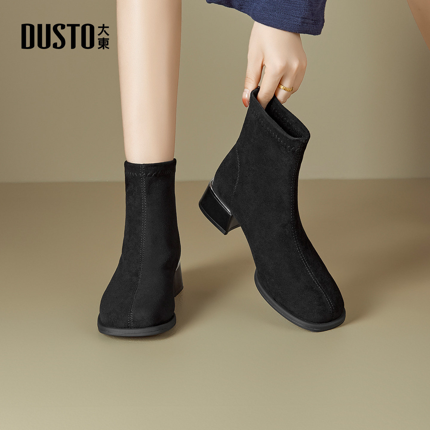 大东官方黑色高跟短靴女2025新款冬季方头靴子女款绒面弹力瘦瘦靴