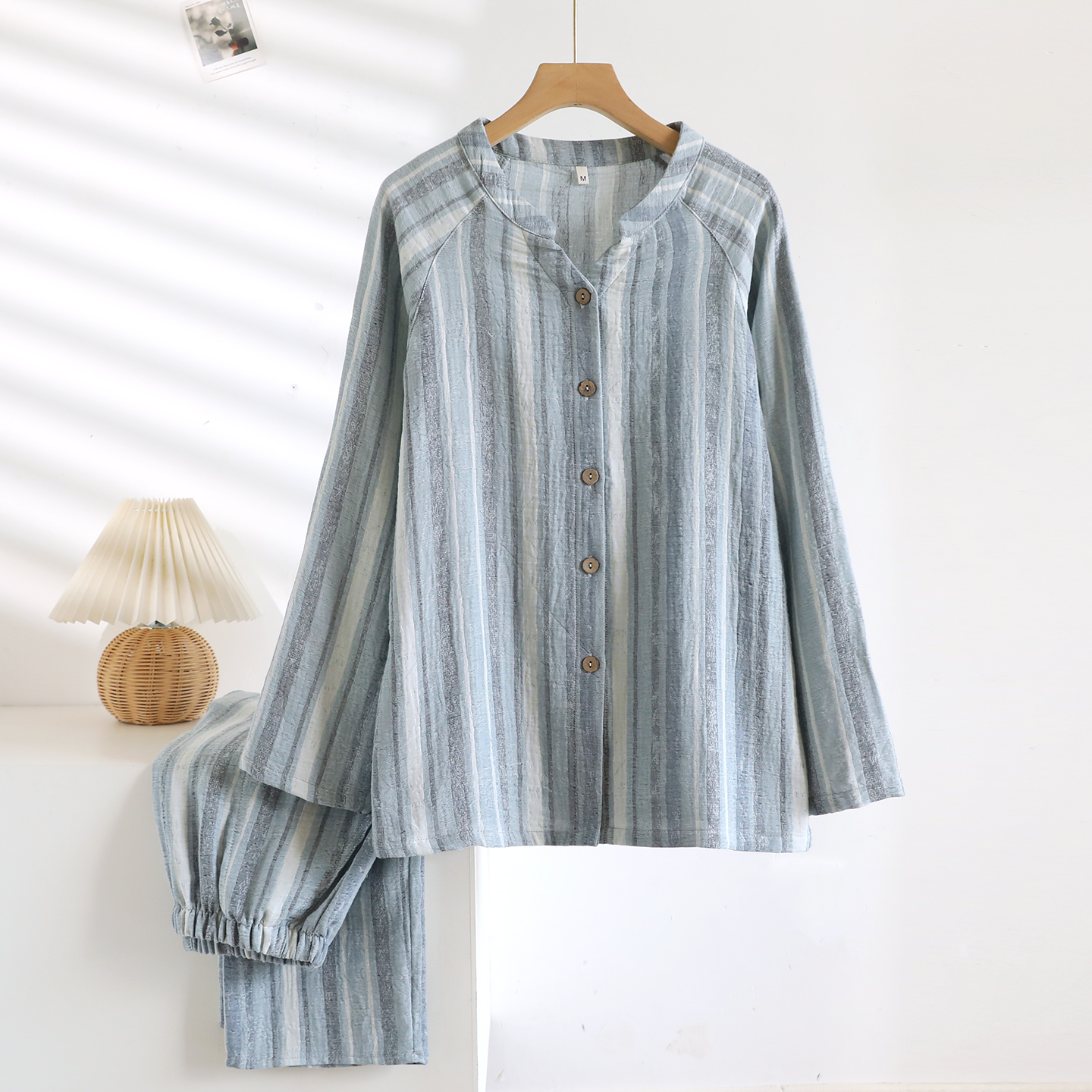韩版时尚双层纯棉纱布睡衣女春秋夏季全棉宽松V领长袖家居服套装