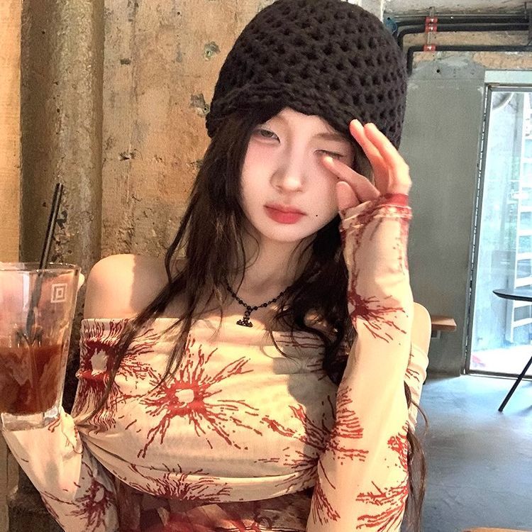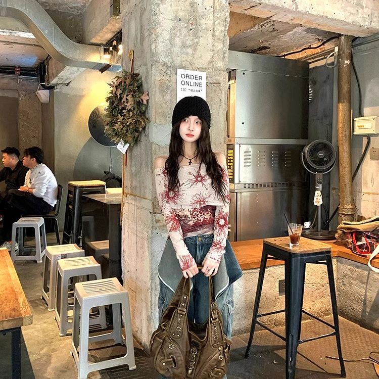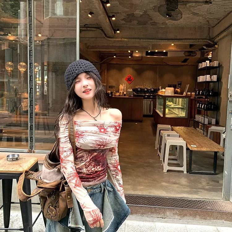 一字肩复古印花长袖网纱T恤女春夏修身设计感辣妹修身打底衫上衣