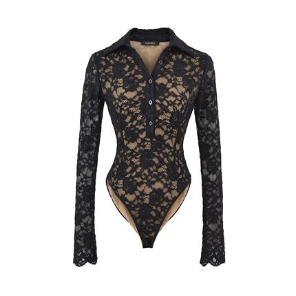 包邮美式性感修身双层浮雕花朵蕾丝衬衫领连体衣女长袖连体打底衫