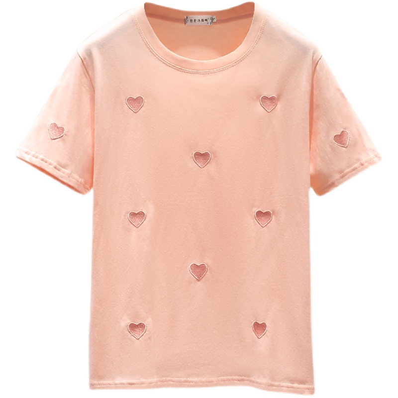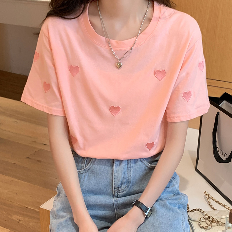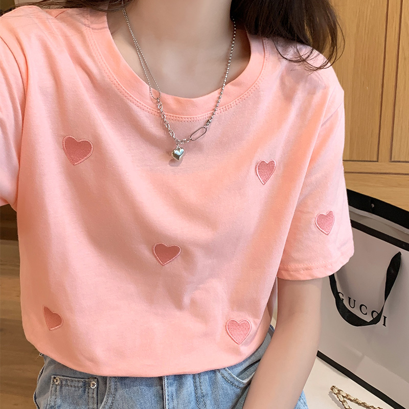 重工爱心刺绣纯棉短袖T恤女2023夏季新款韩版宽松半袖正肩上衣服