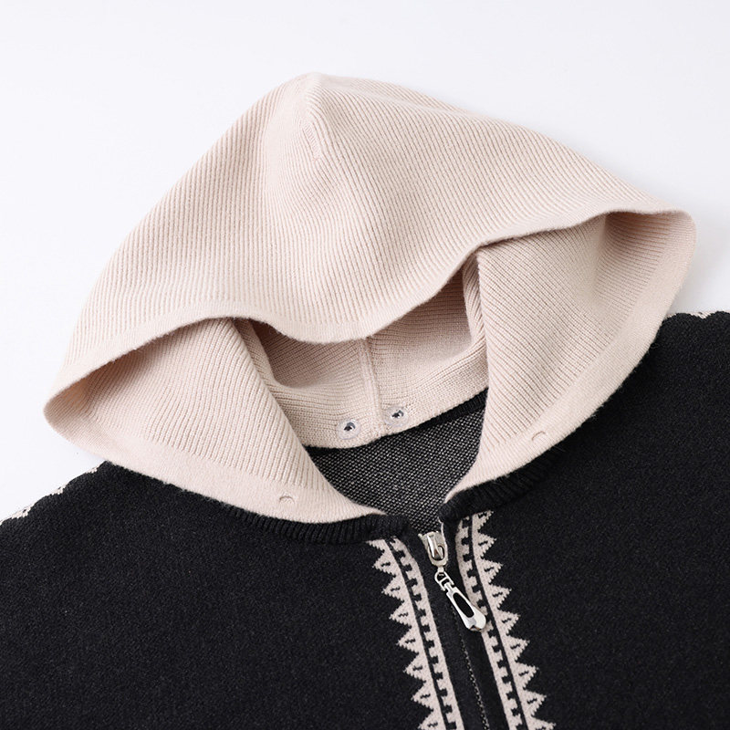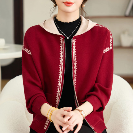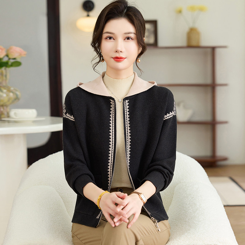 鄂尔多斯市妈妈春装新款羊毛连帽拉链外套中老年女士夹克针织开衫