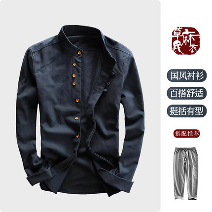 草民麻衣春夏亚麻长袖立领衬衫男新中式国风棉麻衬衣外套休闲上衣