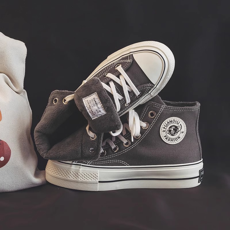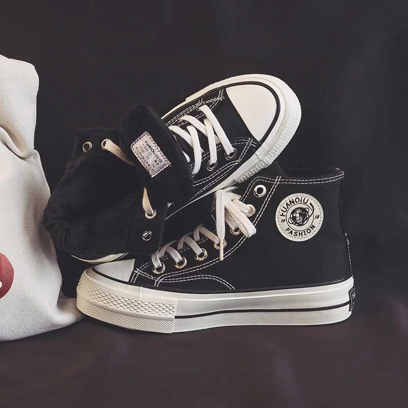 环球女鞋红色加绒高帮帆布鞋秋冬学生保暖板鞋ins潮运动鞋女棉鞋