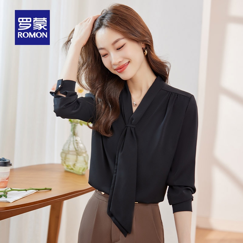 罗蒙女士通勤V领长袖衬衫2025秋季新款气质优雅时尚休闲职业衬衣
