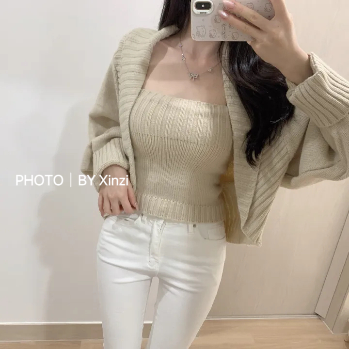 辛子韩国代购外套针织外穿开衫女两件套毛衣翻领简约开衫抹胸背心
