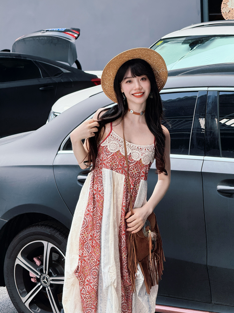 夏日新款度假风蕾丝拼接花布可爱俏皮棉绸吊带连衣裙宽松 好质量