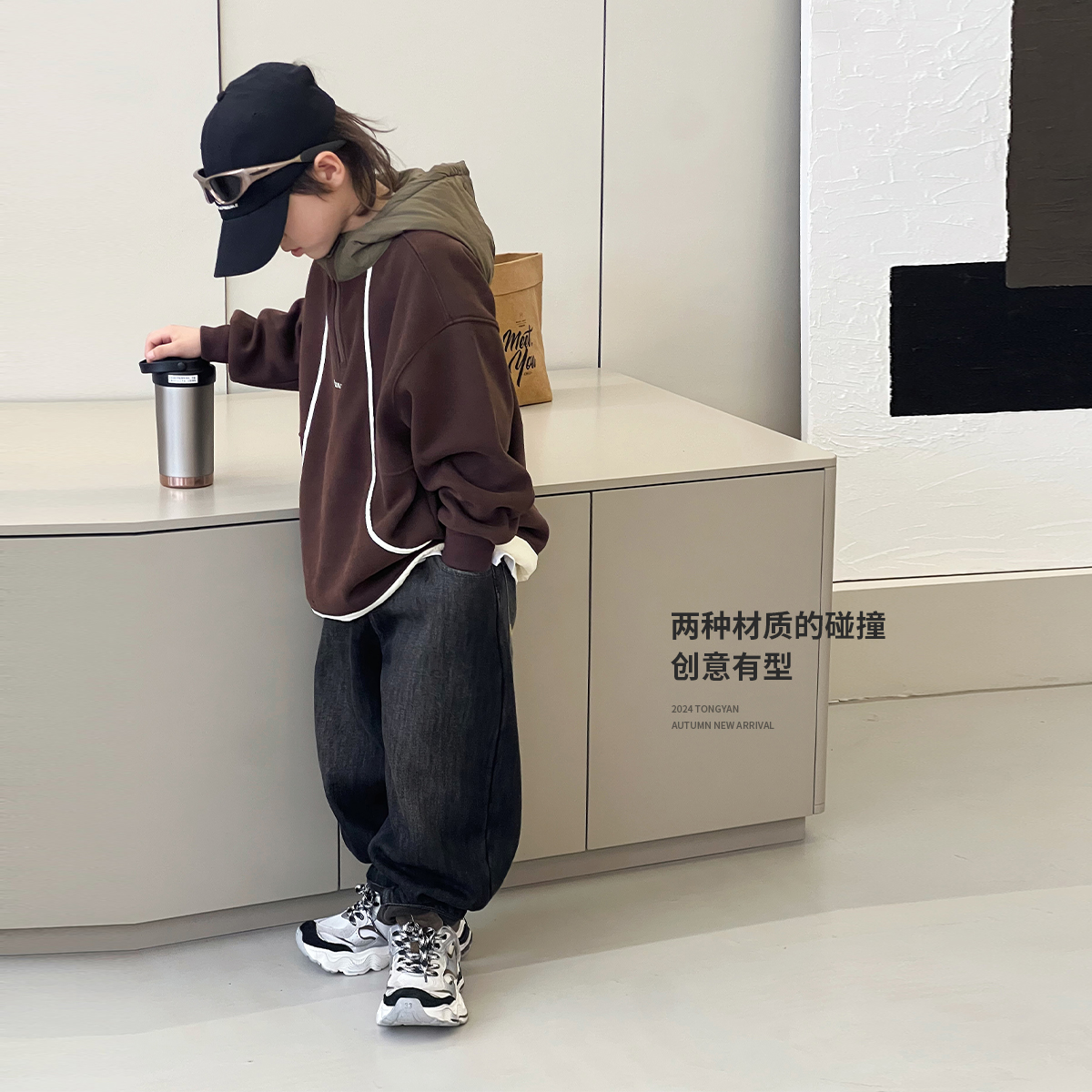 男童加绒卫衣2024冬装新款韩版中大童上衣拼接套头衫加厚儿童外套
