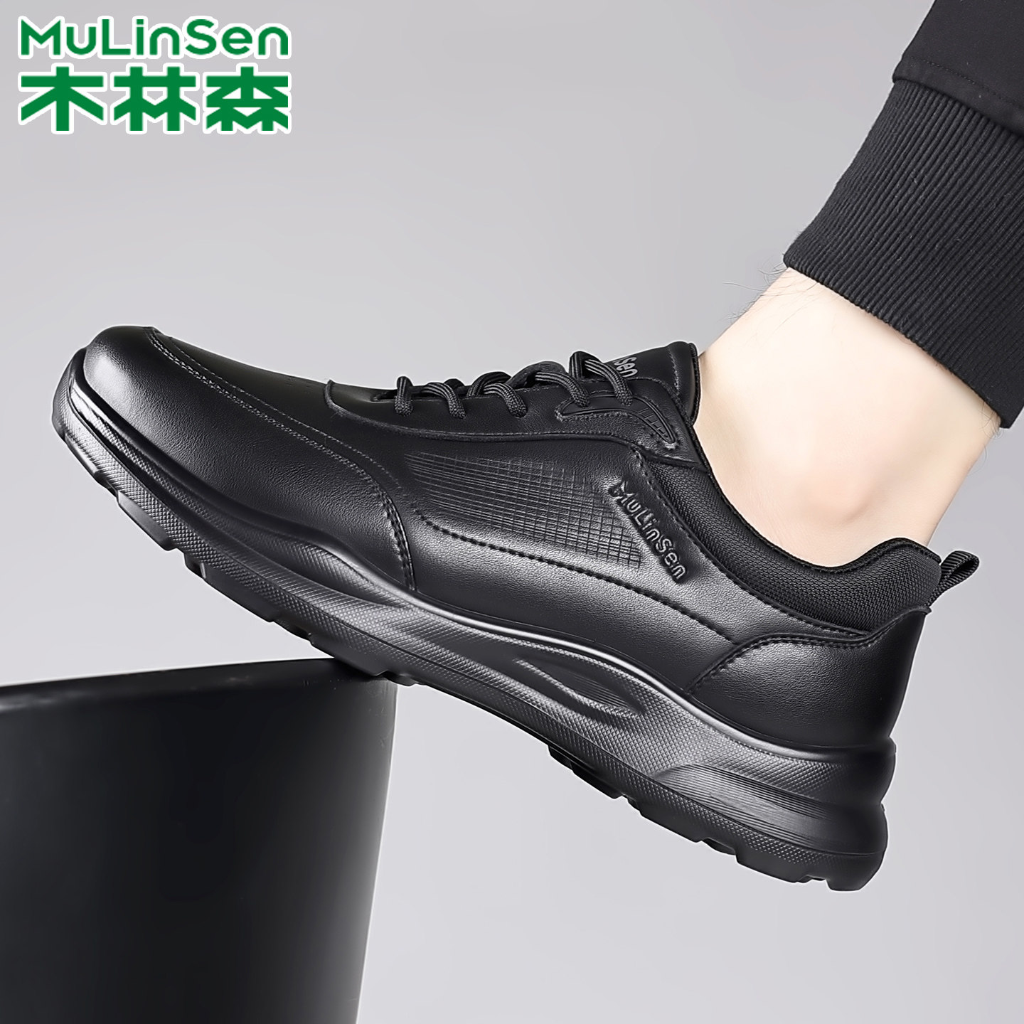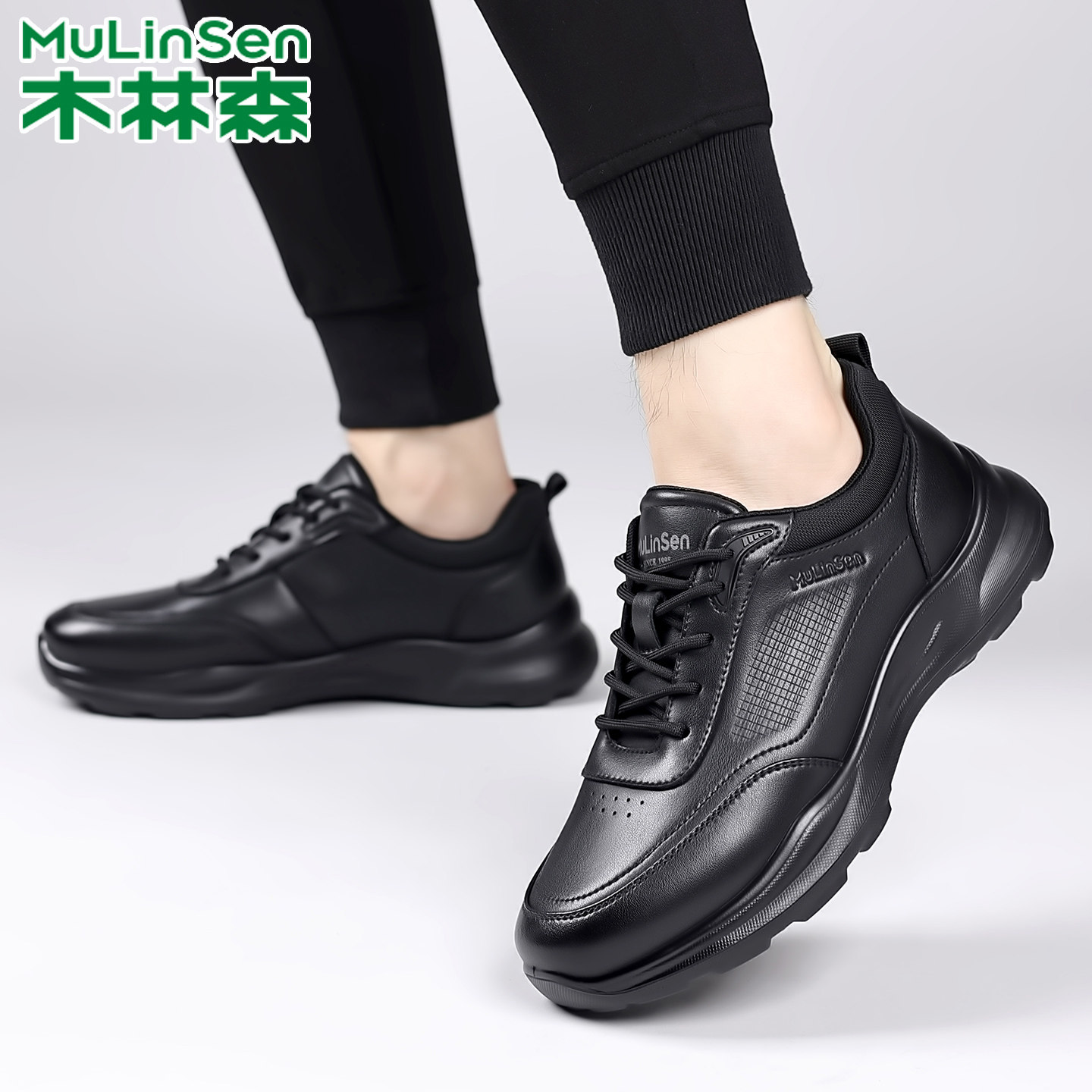 木林森男士加绒休闲皮鞋真皮黑色系带运动鞋保暖耐磨软底跑步鞋潮