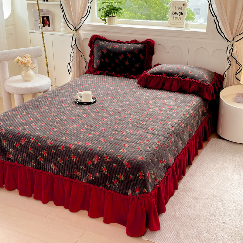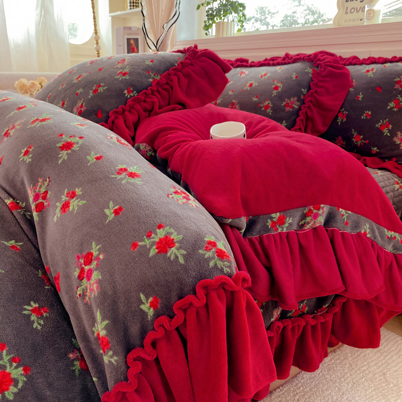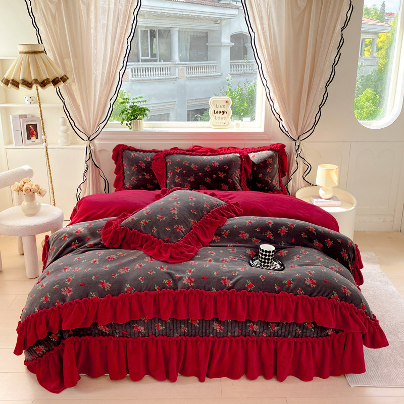冬季加厚牛奶绒床盖被套四件套公主风珊瑚绒花边被套夹棉床单被罩