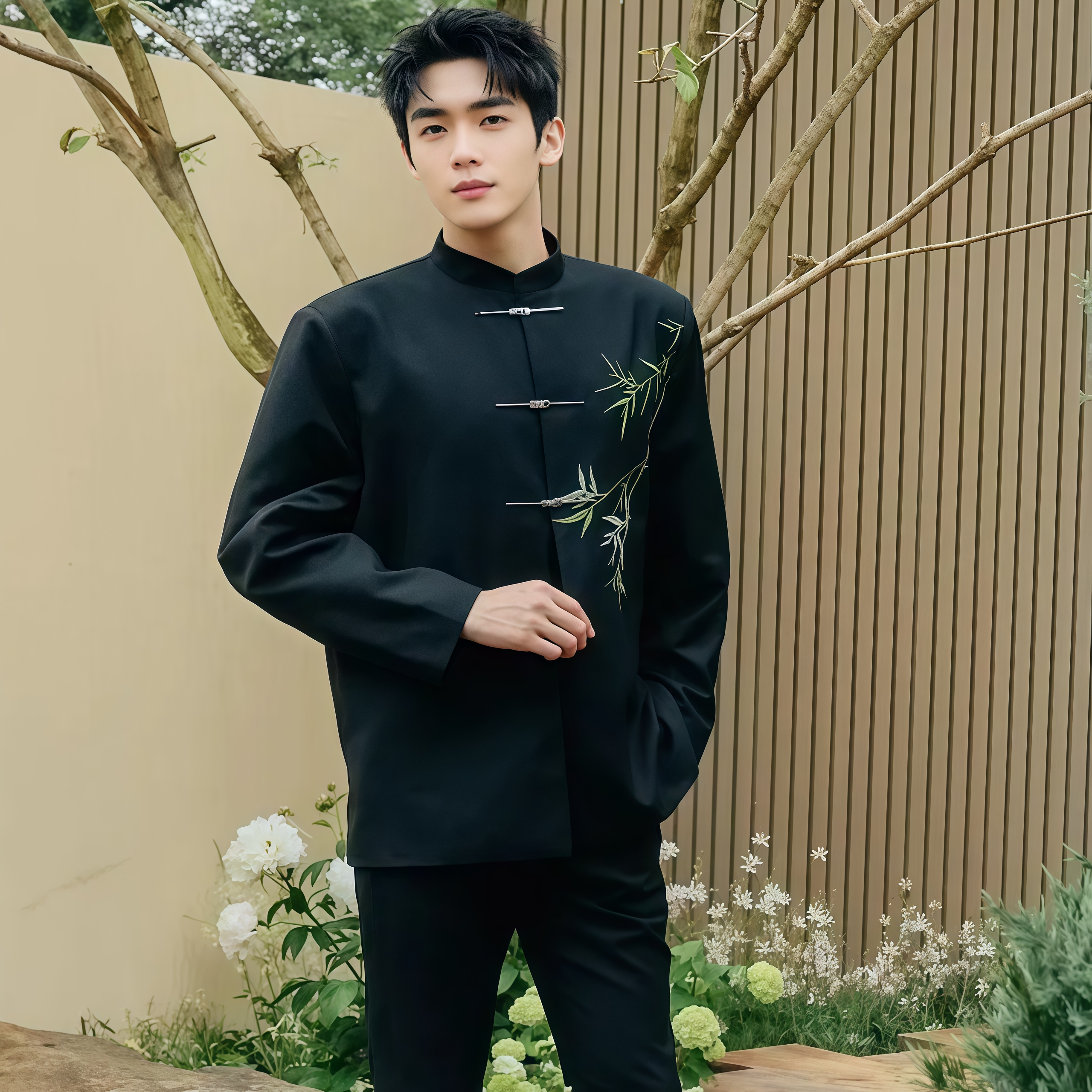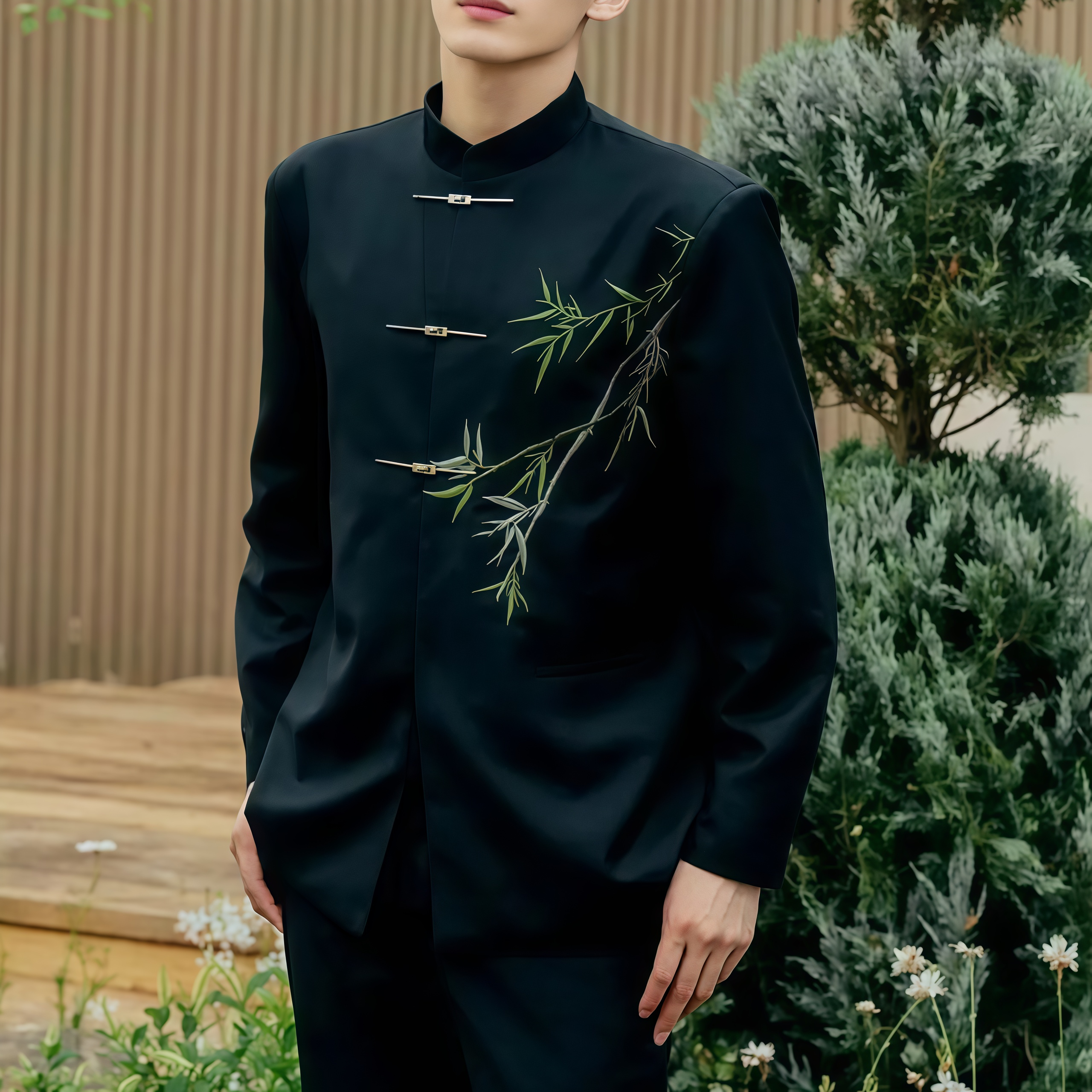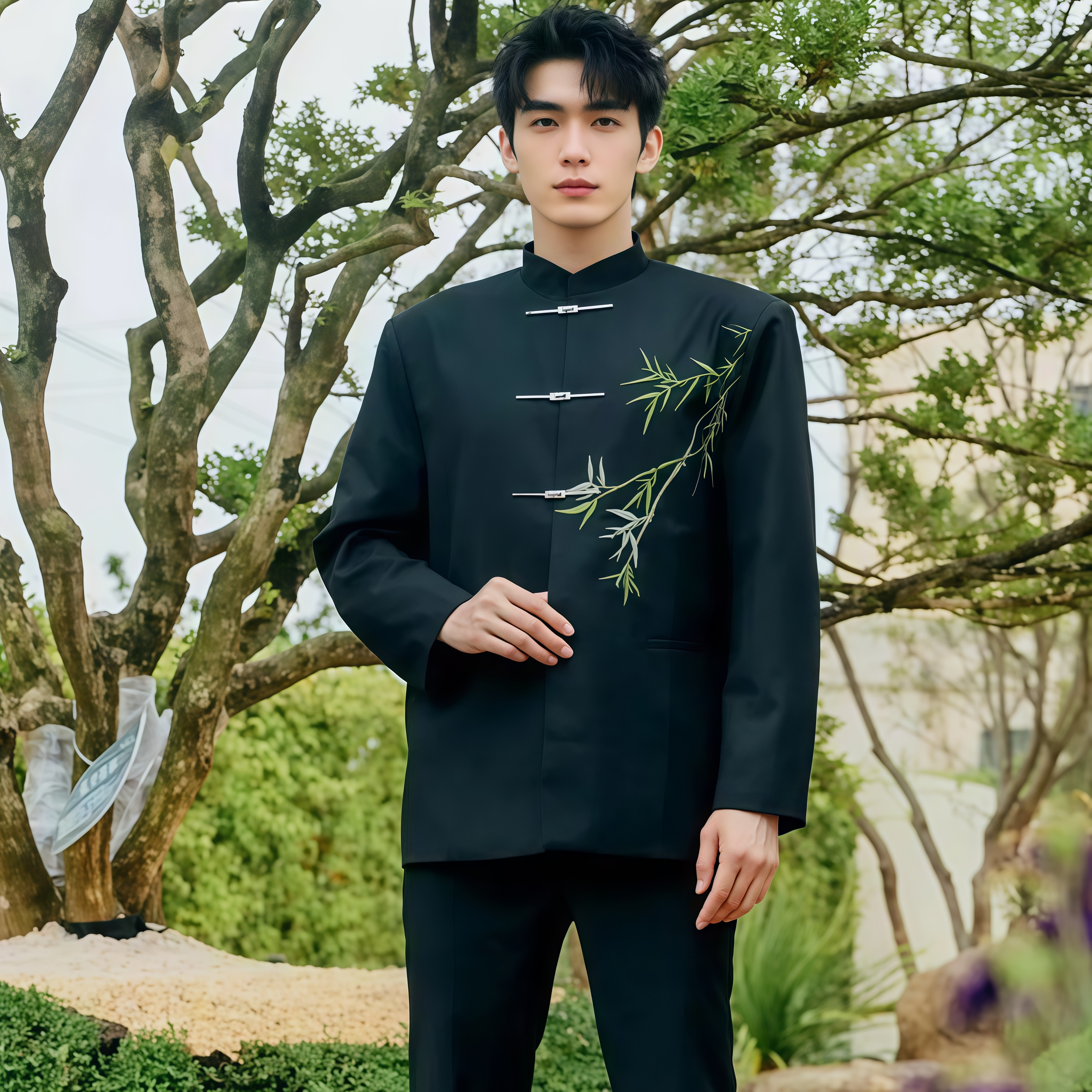 欢喜橙 新中式男士西服中山装订婚新郎礼服正装休闲西装翠竹刺绣