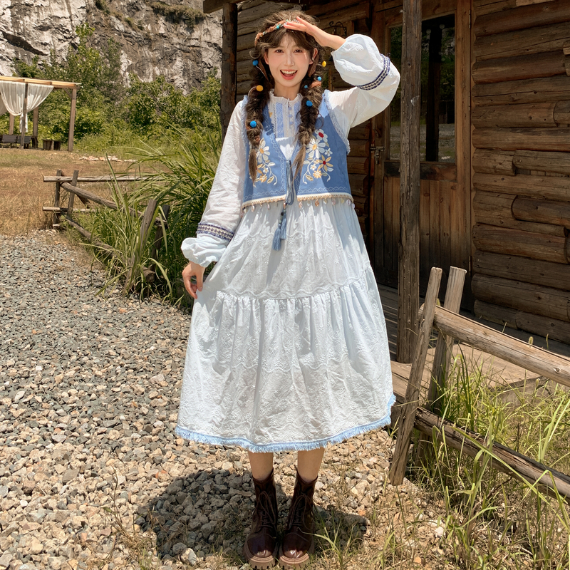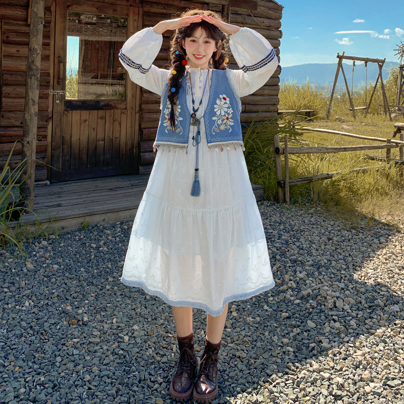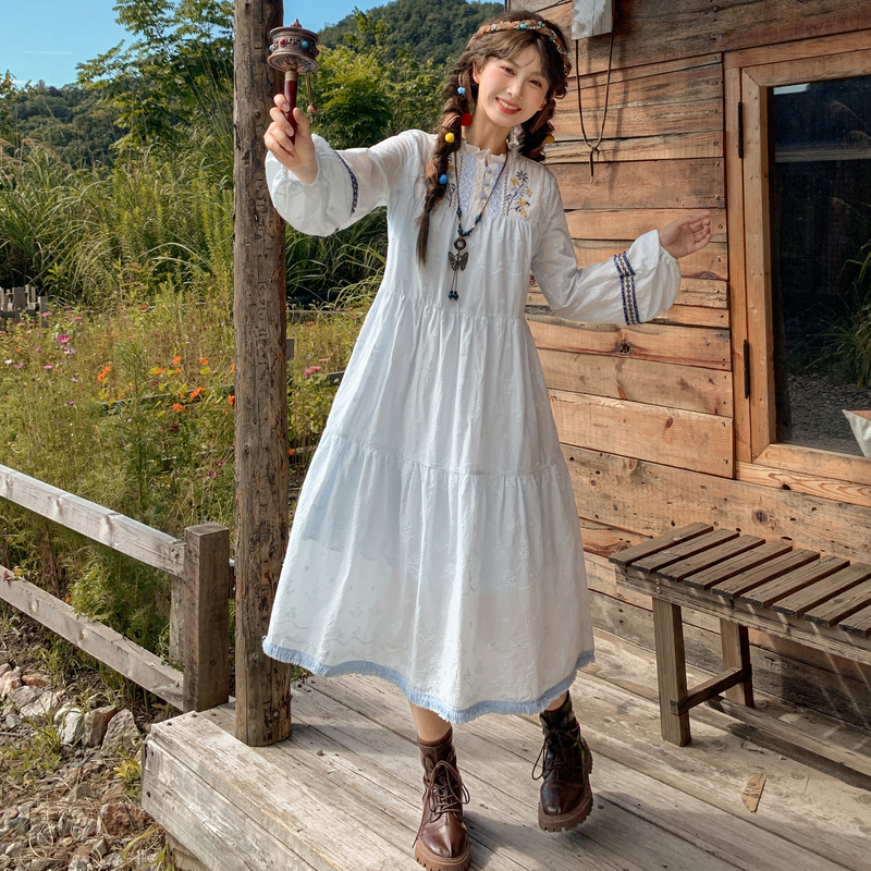 森女部落设计感大摆重工刺绣旅游度假风长袖连衣裙女2025新款秋季