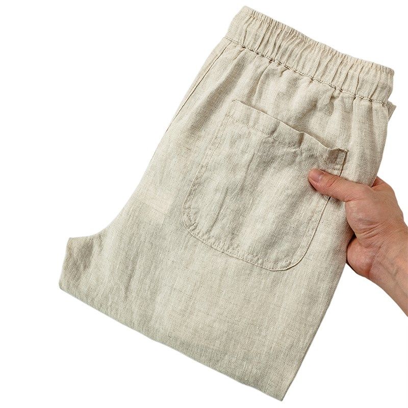 100%纯亚麻九分裤子夏季薄款透气凉爽宽松直筒修身松紧腰休闲裤男