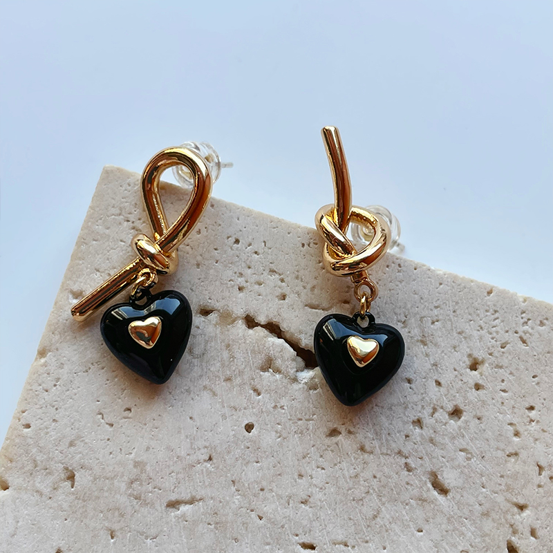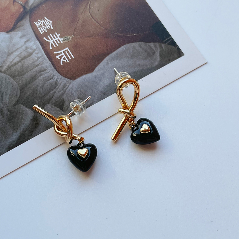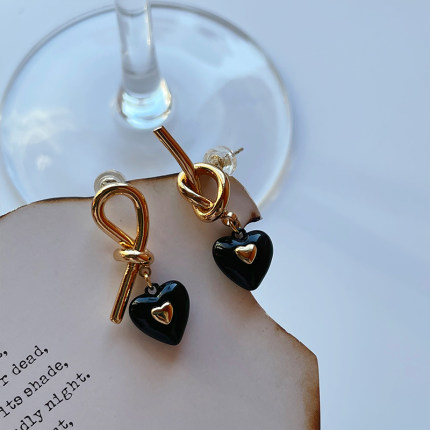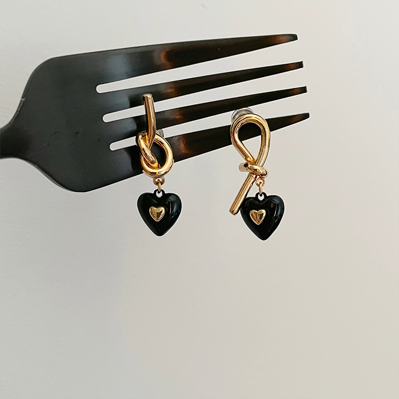 2025年新款黑色爱心不对称打结耳钉复古桃心吊坠耳环小众高级耳饰