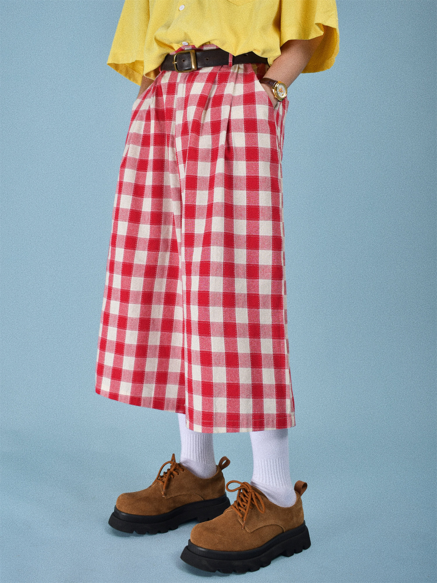 C2自制休闲半松紧格子七分裤短裤