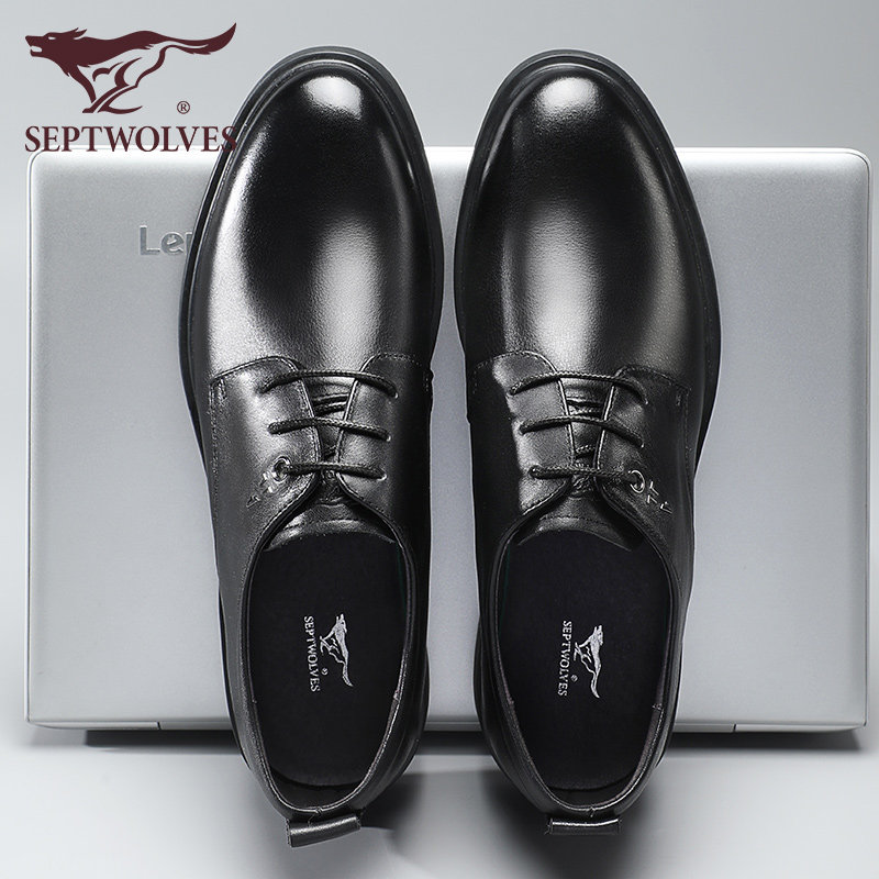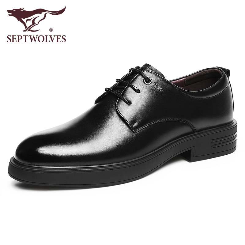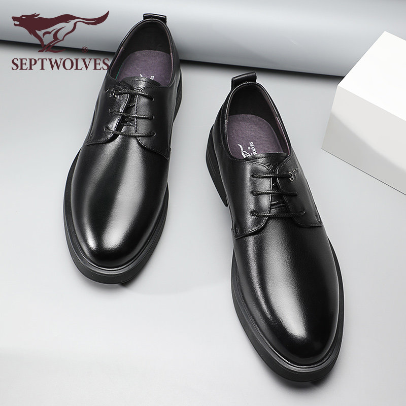 七匹狼厚底真皮皮鞋男黑色商务正装鞋秋透气男士保安上班休闲鞋子