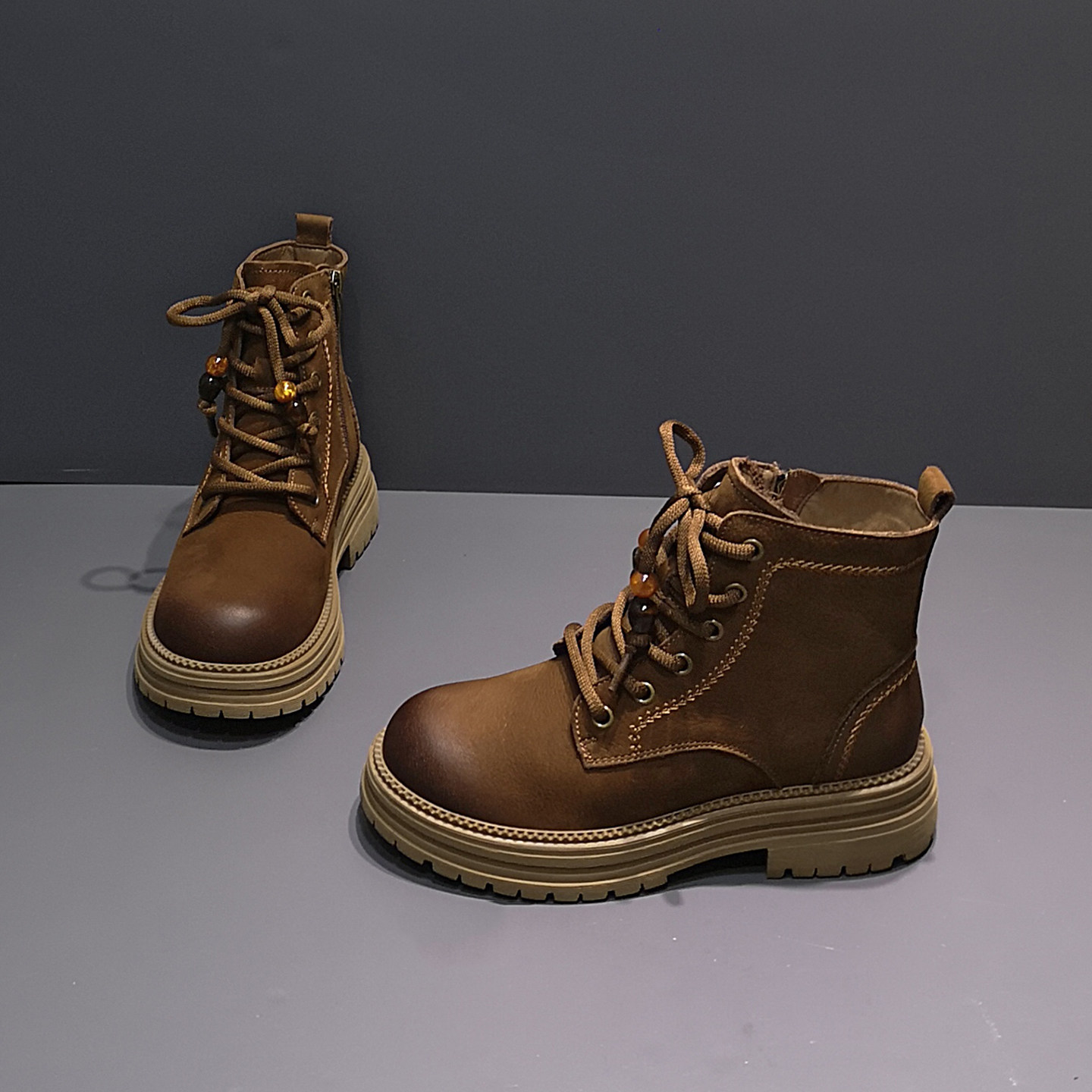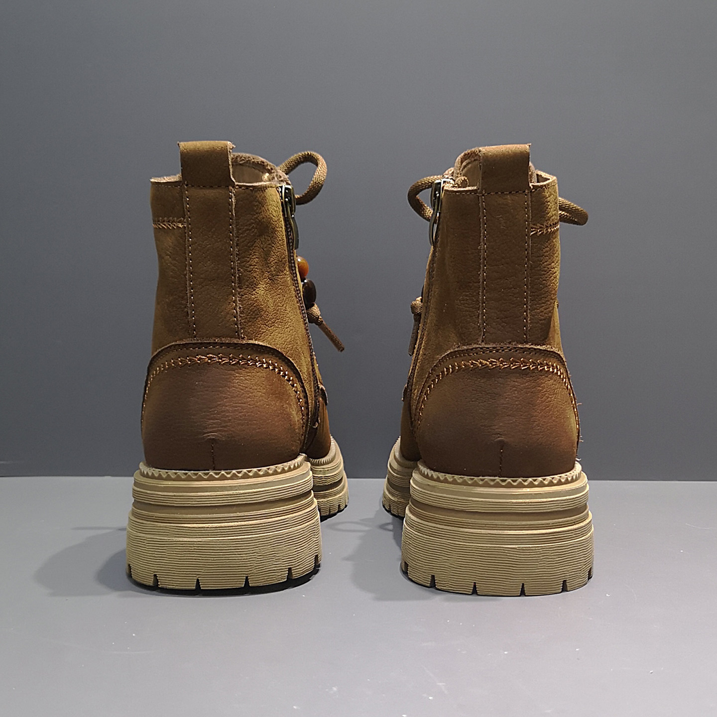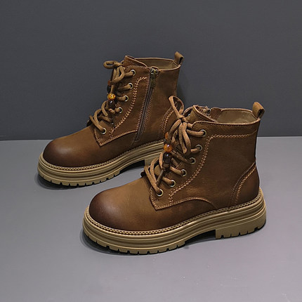 2025秋冬加绒圆头厚底休闲拉链串珠马丁高帮鞋女时尚头层牛皮潮鞋