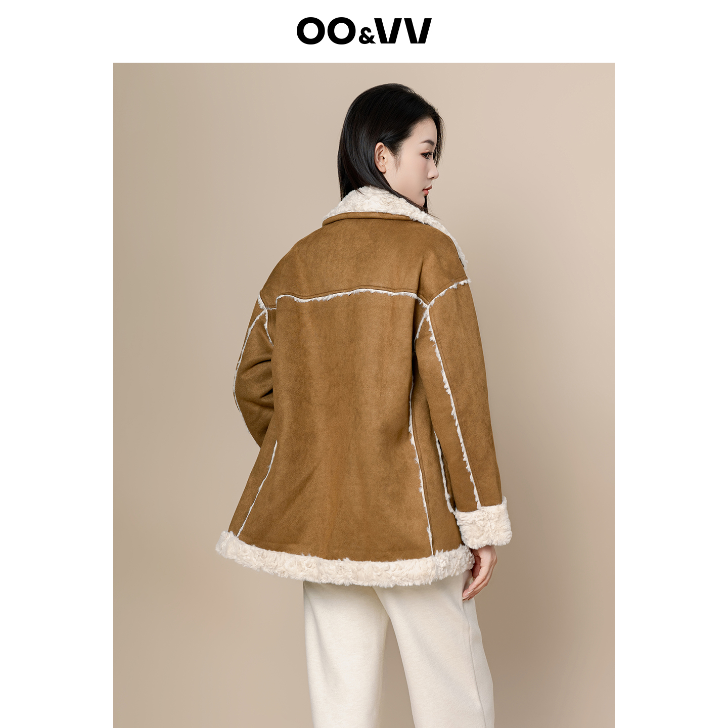 oo&vv皮毛一体中长款外套女25秋冬加厚保暖仿麂皮绒翻领棉服上衣