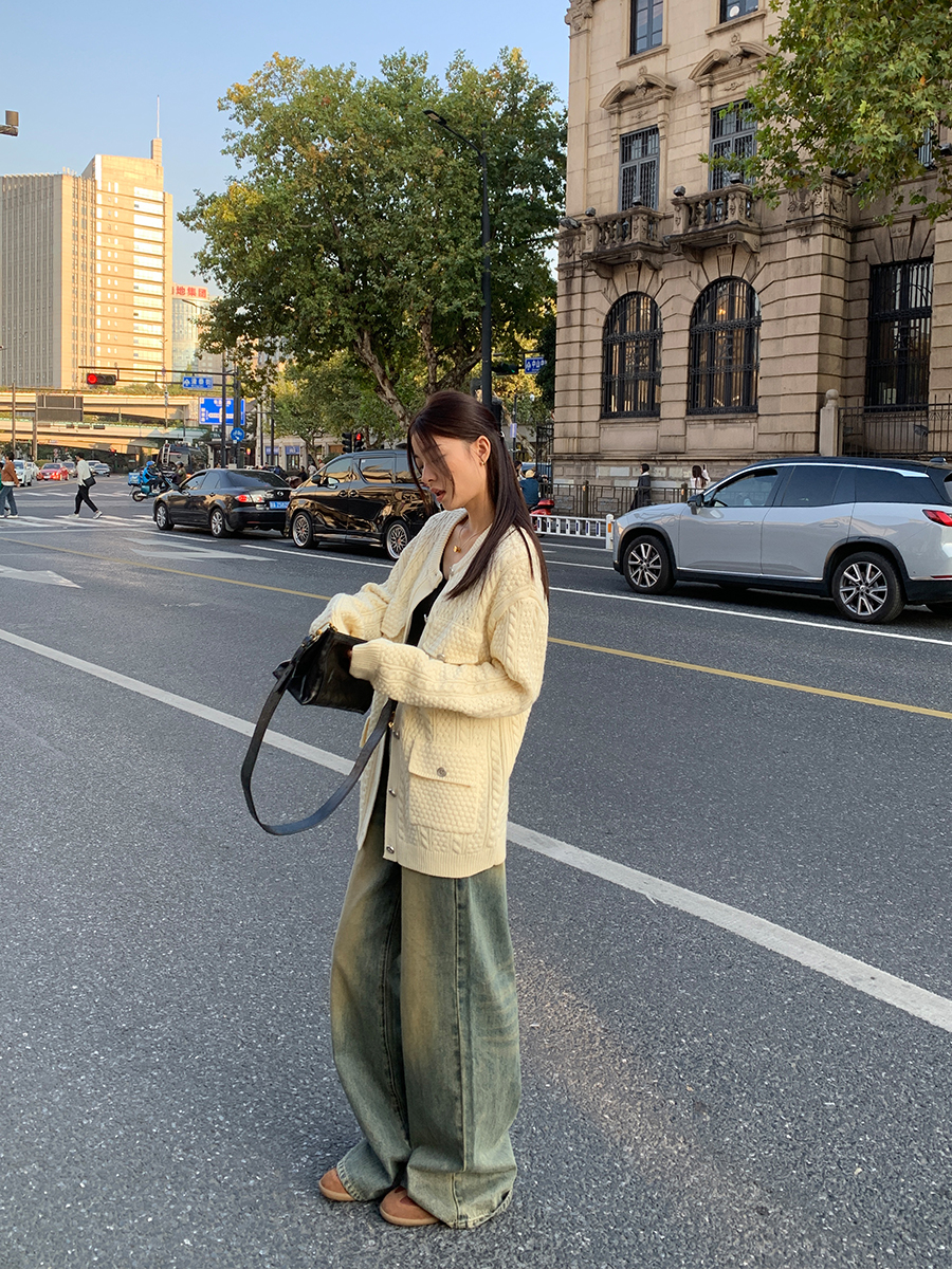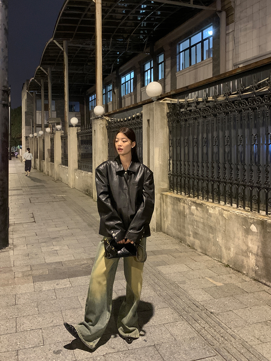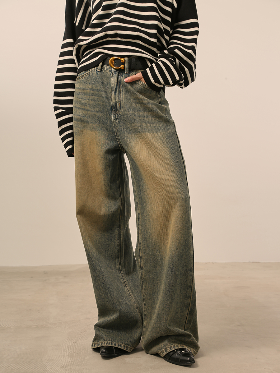 洛边 全喷马骝描线工艺 做旧复古洗水款牛仔裤宽松百搭显瘦阔腿裤