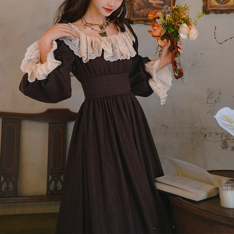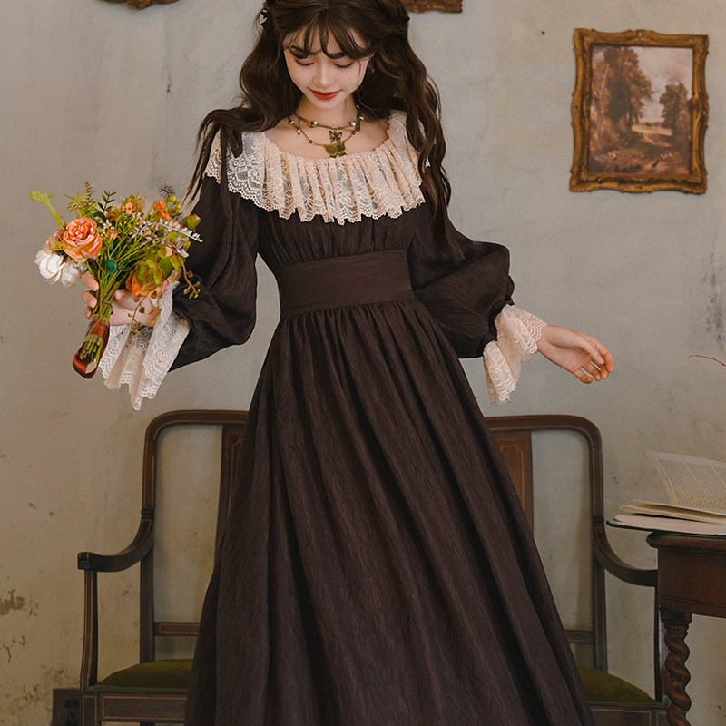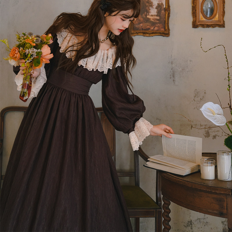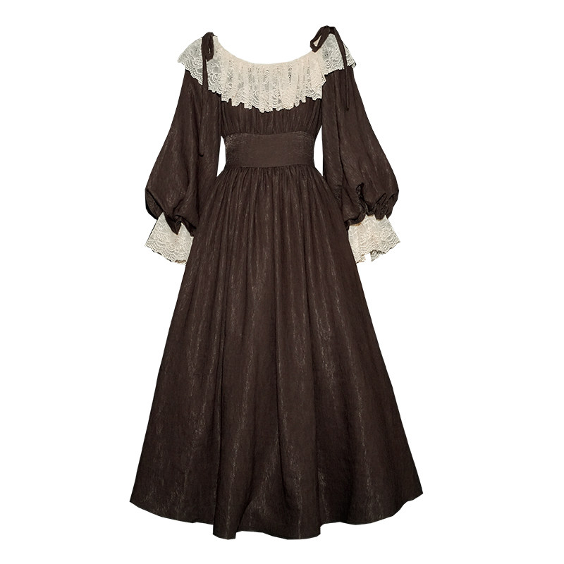 弥爱原创《褐羽沉檀》法式宫廷复古蕾丝束腰灯笼袖提花肌理连衣裙