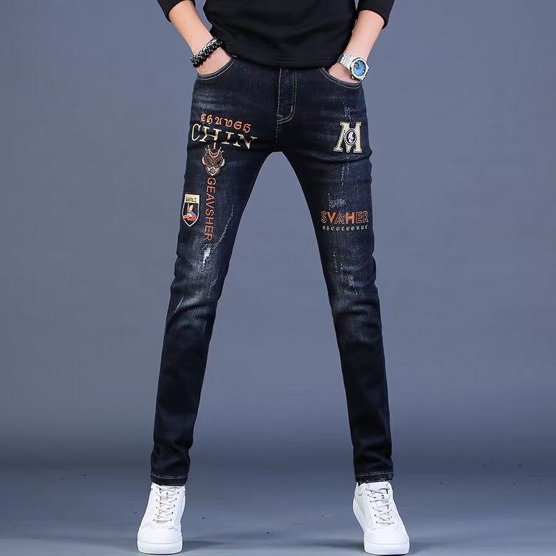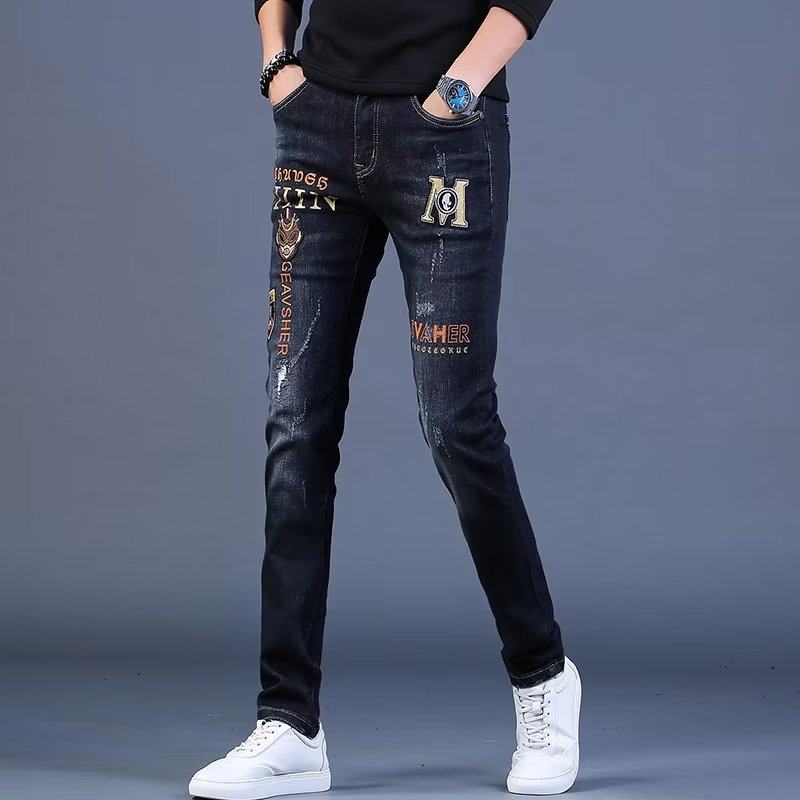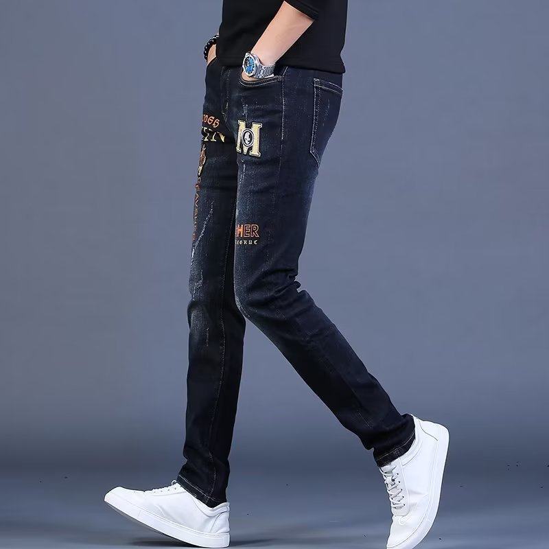 欧货潮牌刺绣牛仔裤男春秋新款弹力修身小脚裤潮流百搭休闲长裤子