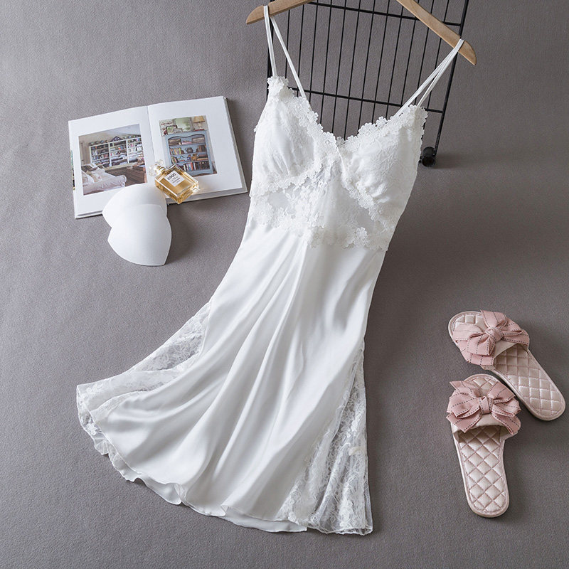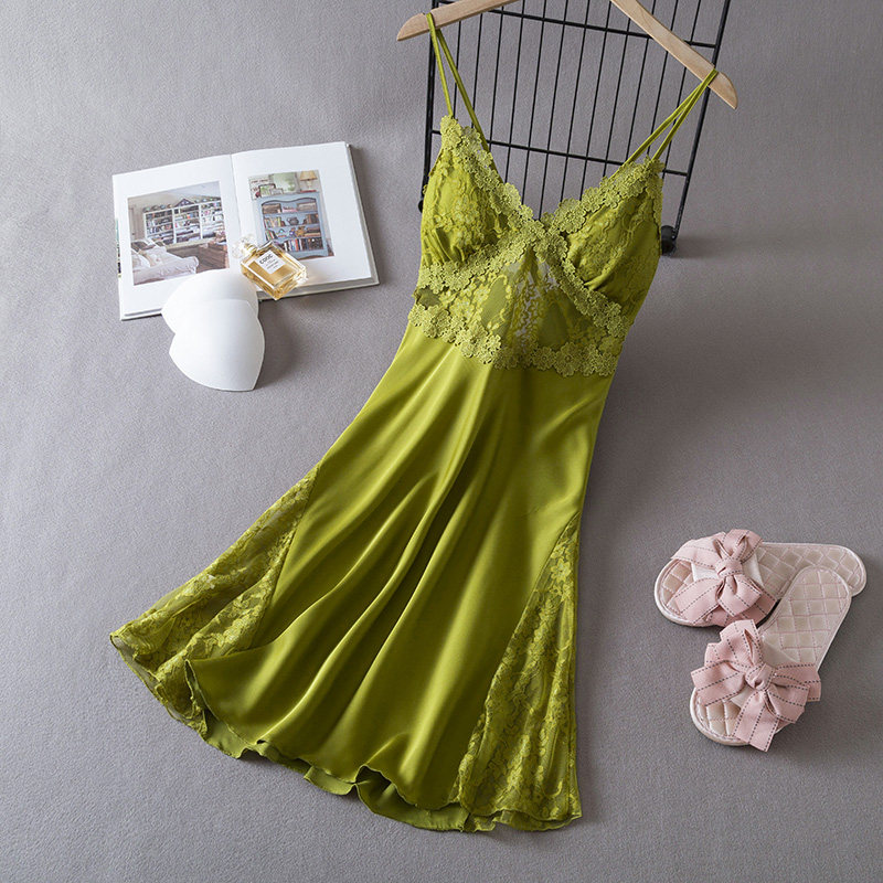 韩版性感睡裙女夏V领冰丝吊带睡裙V领薄款带胸垫蕾丝边纯欲家居服