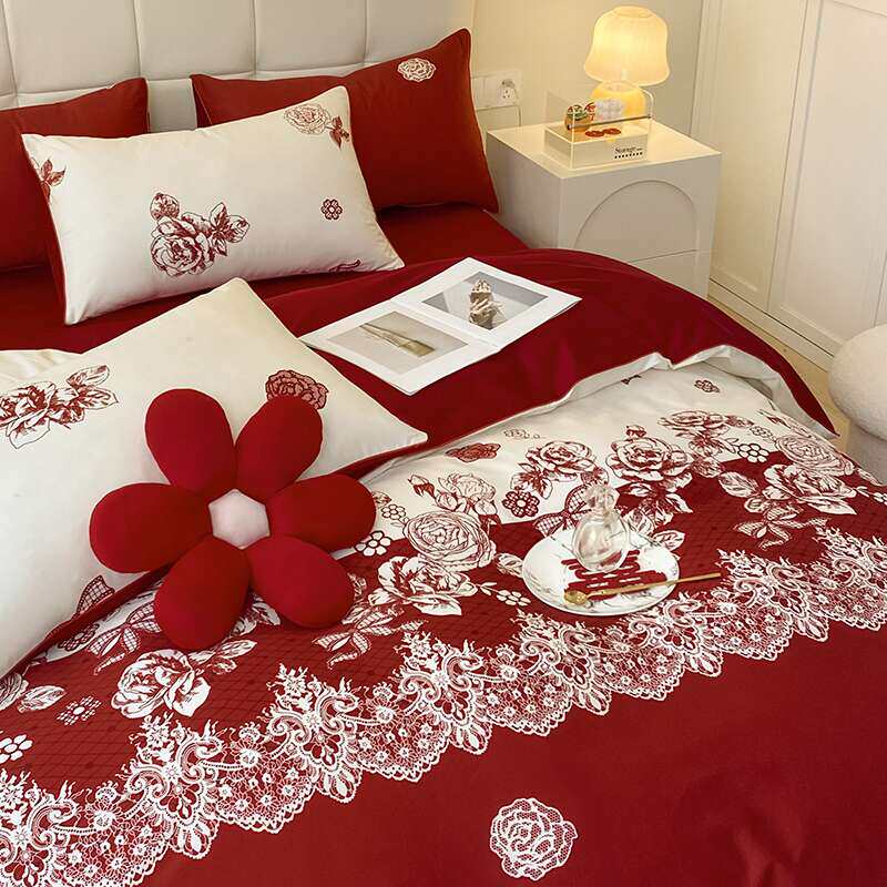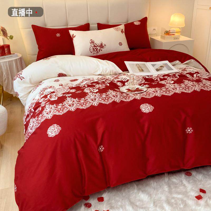中式简约结婚四件套大红色新婚床单被套纯棉婚庆床上用品婚房陪嫁
