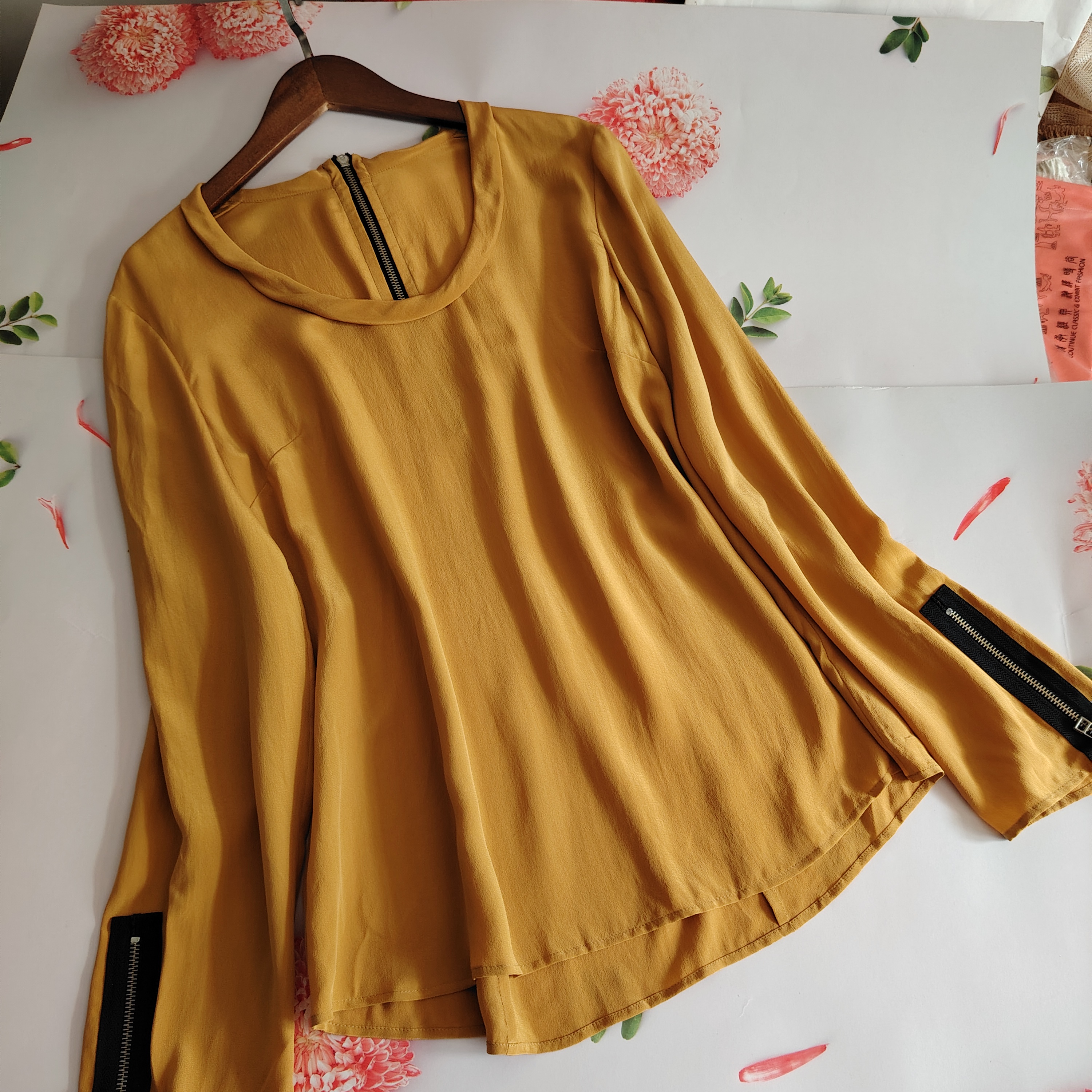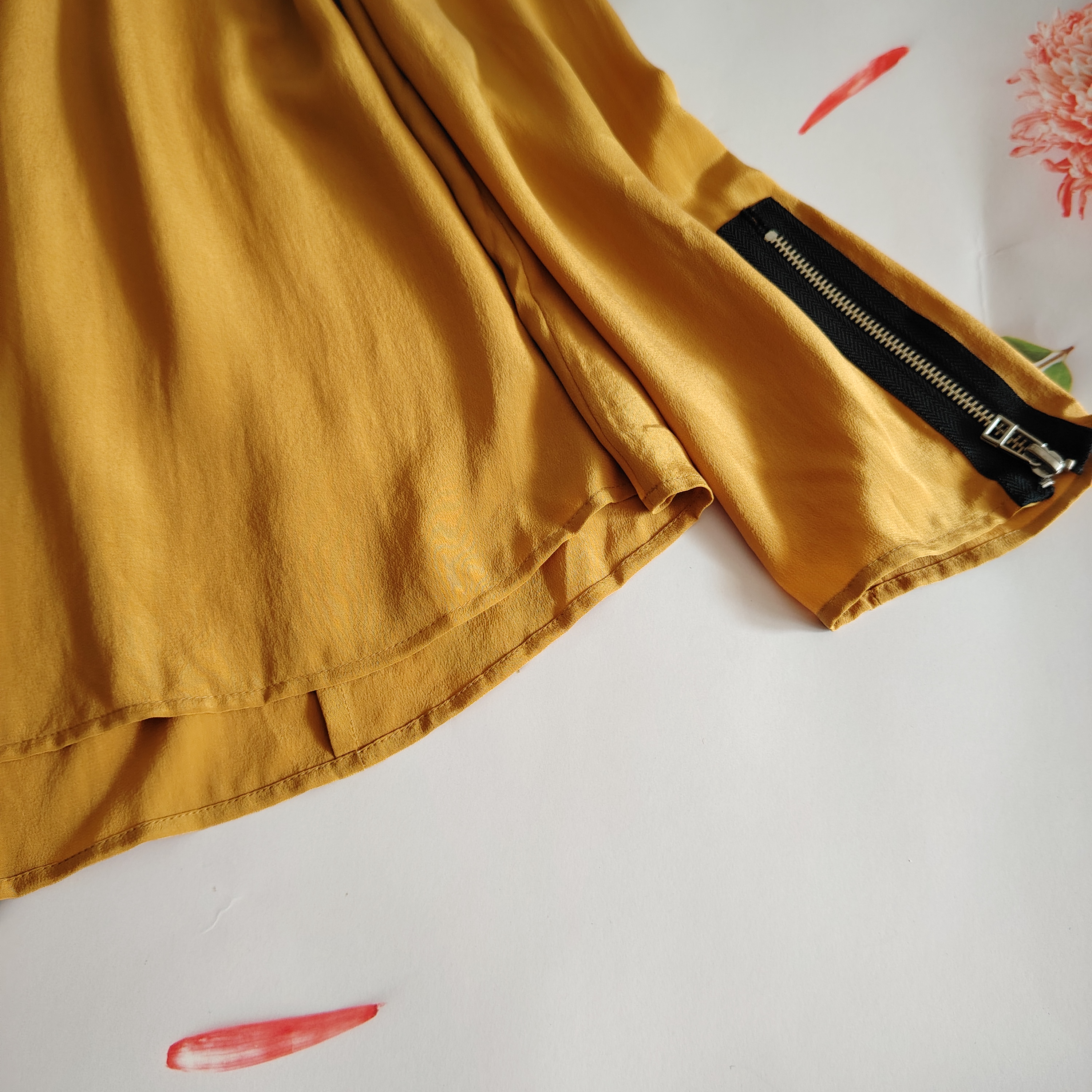 纯色真丝双绉桑蚕丝拉链装饰长袖圆领套头宽松通勤洋气衬衫衬衣