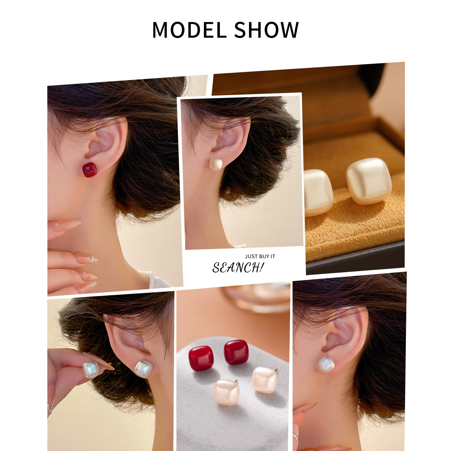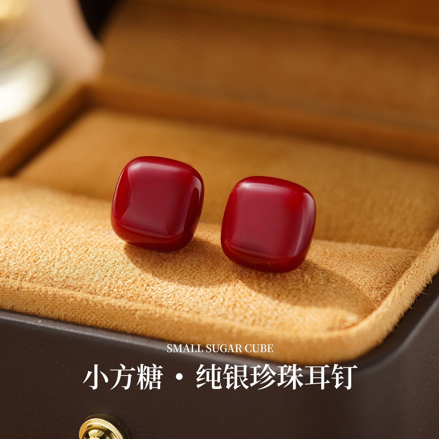 925纯银针小方糖珍珠耳钉女法式轻奢高级感耳环气质秋冬红色耳饰