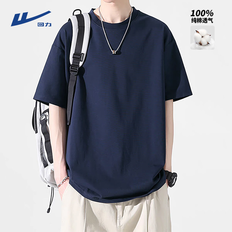 回力短袖t恤男夏季2025新款美式重磅男款宽松纯棉藏青色半袖男生A