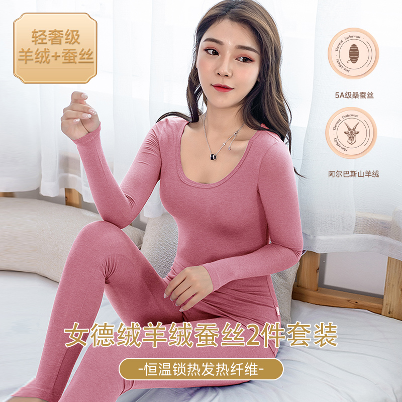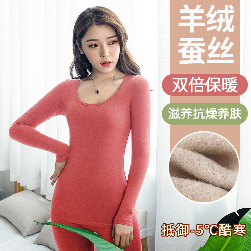 秋冬女士保暖内衣基础圆领棉毛衫加绒秋衣秋裤内衣套装无痕打底衫