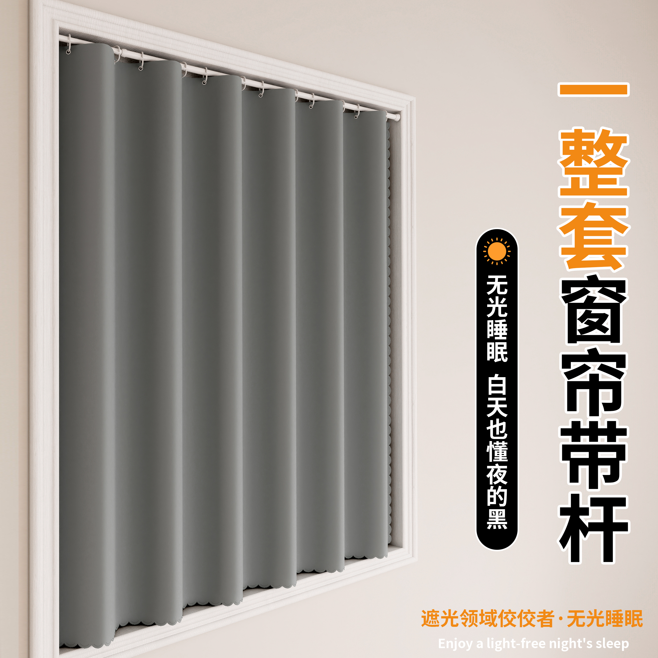 遮光窗帘卧室2025新款家用遮阳布防晒隔热成品飘窗免打孔带杆全套