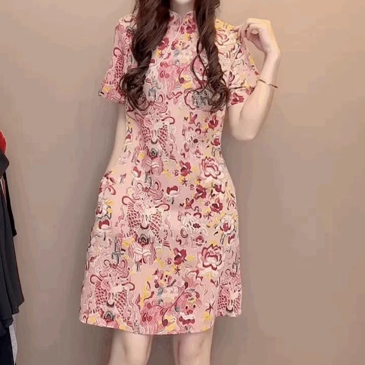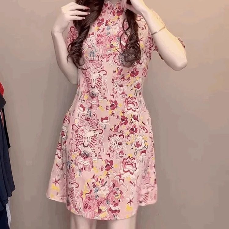 碎花立领盘扣改良旗袍裙粉色裙子高端轻奢中国风短袖雪纺连衣裙女