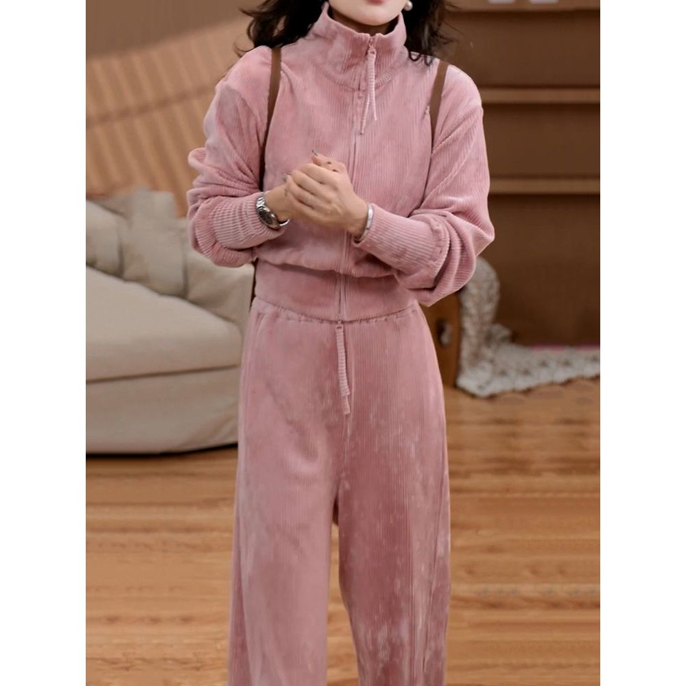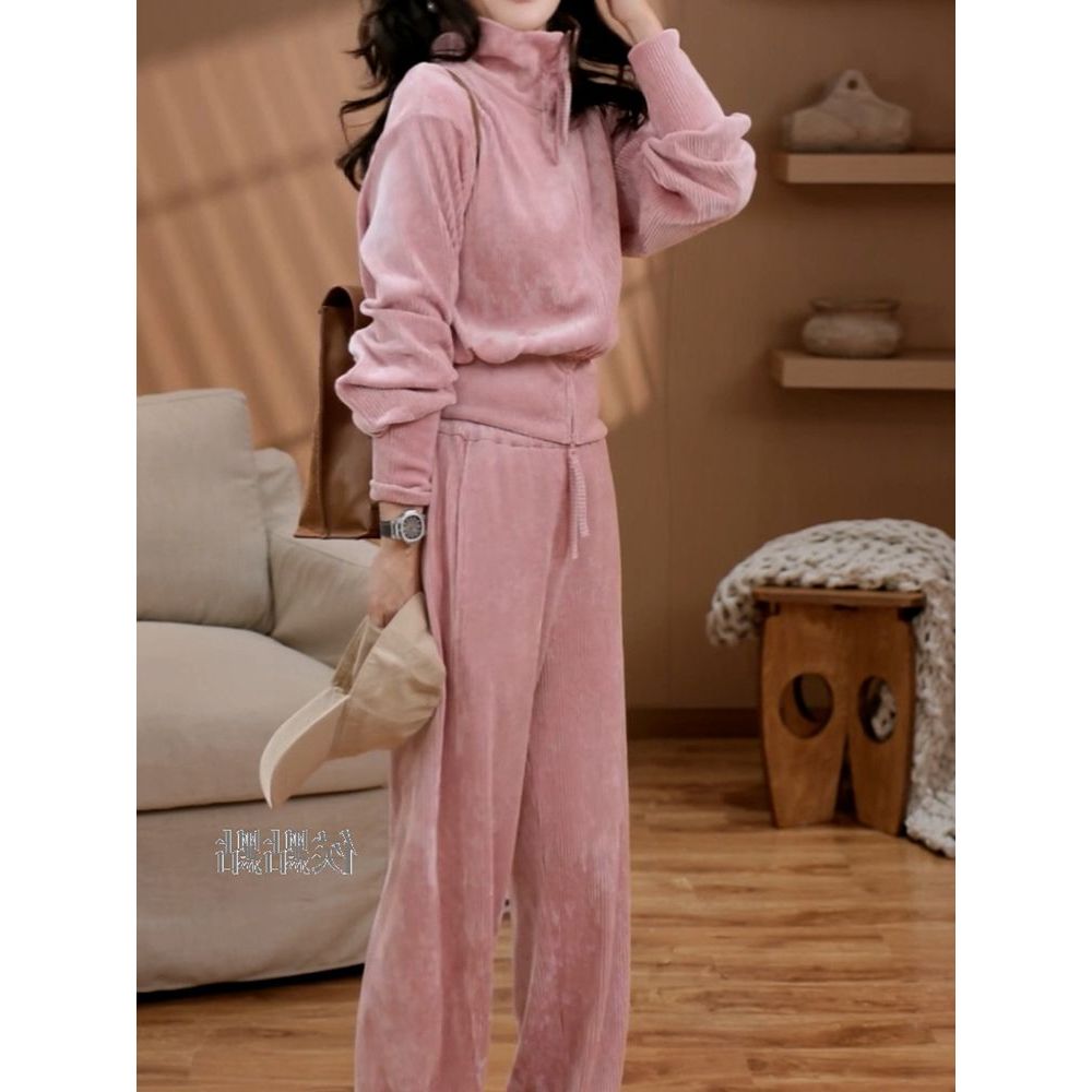 甜美减龄韩系丝绒裤套装女长裤秋季新款高领百搭开衫上衣+阔腿裤