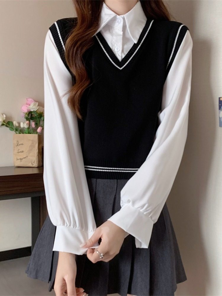 2025秋冬新款设计感小众长袖拼接衬衫短款V领假两件马甲针织衫女