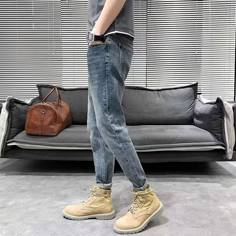 日系复古牛仔裤男款弹力修身小脚九分裤痞帅潮牌休闲宽松哈伦裤子