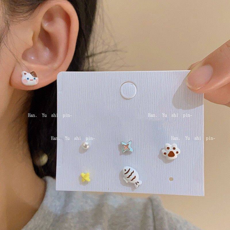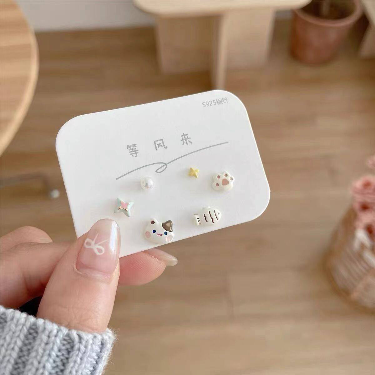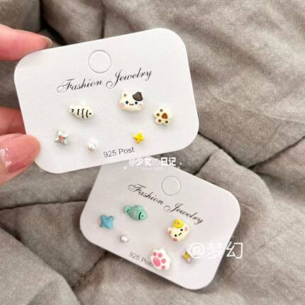 小红书同款可爱猫咪小鱼耳钉小众设计甜美森系星星猫爪六件套耳环