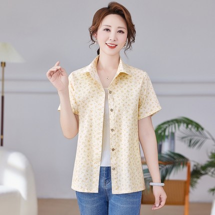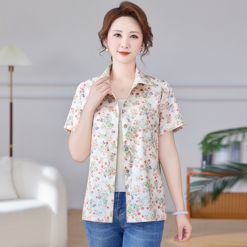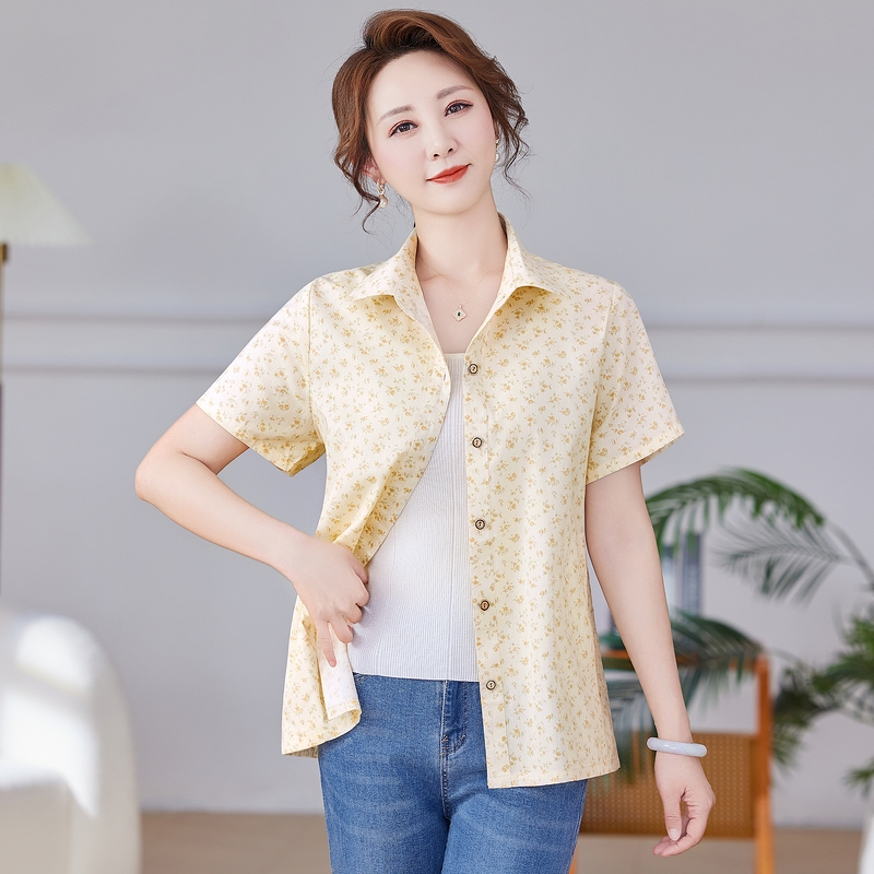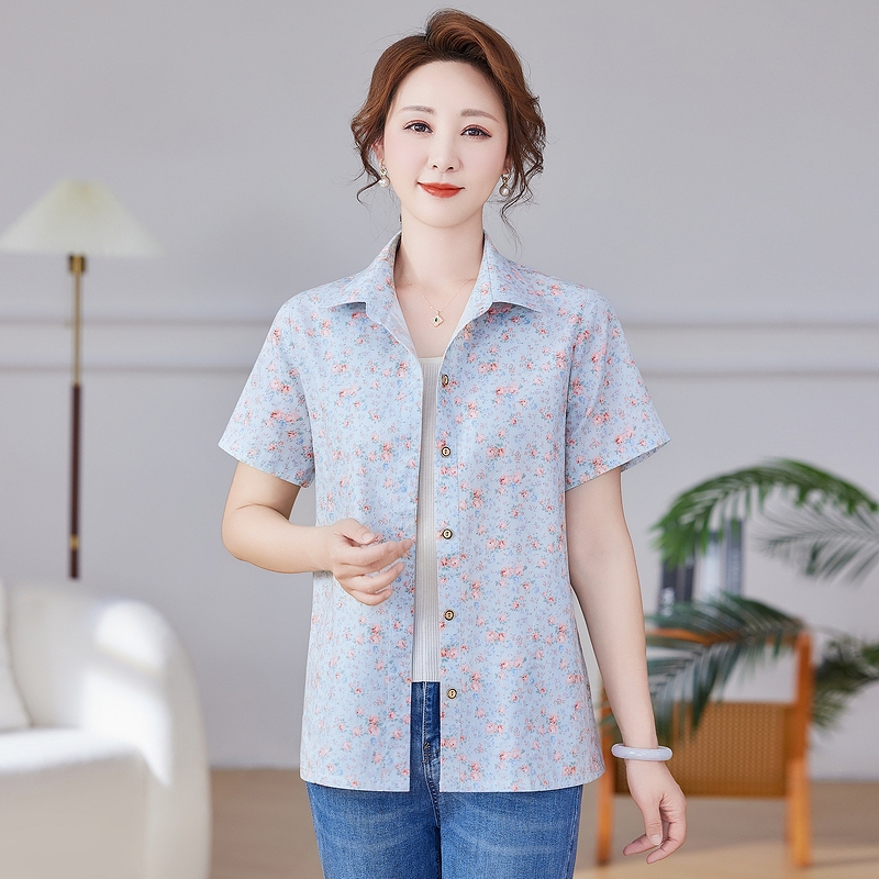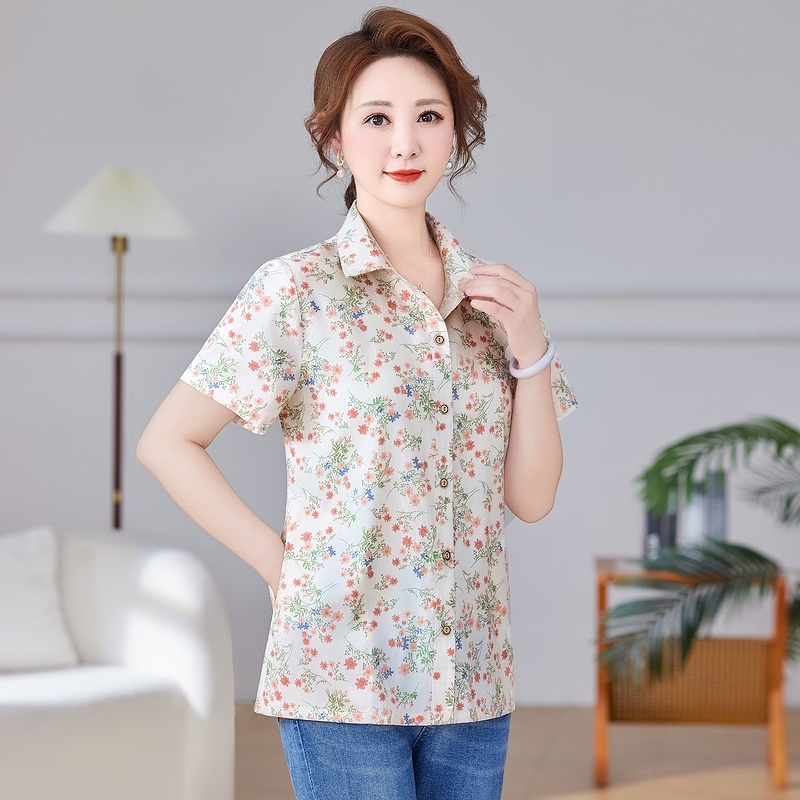 中年妈妈夏装短袖纯棉衬衫老年人女夏季全棉上衣奶奶太太碎花衬衣