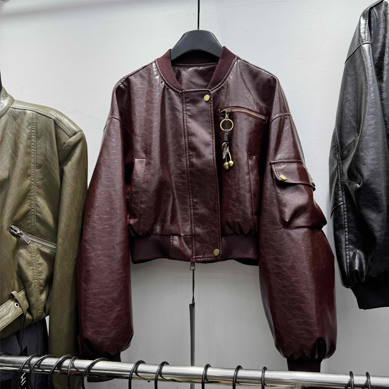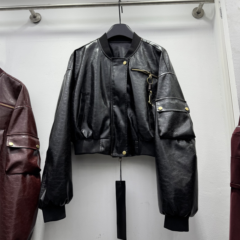 秋上新美式复古辣妹风短款皮衣夹克立领口袋拉链外套皮衣女