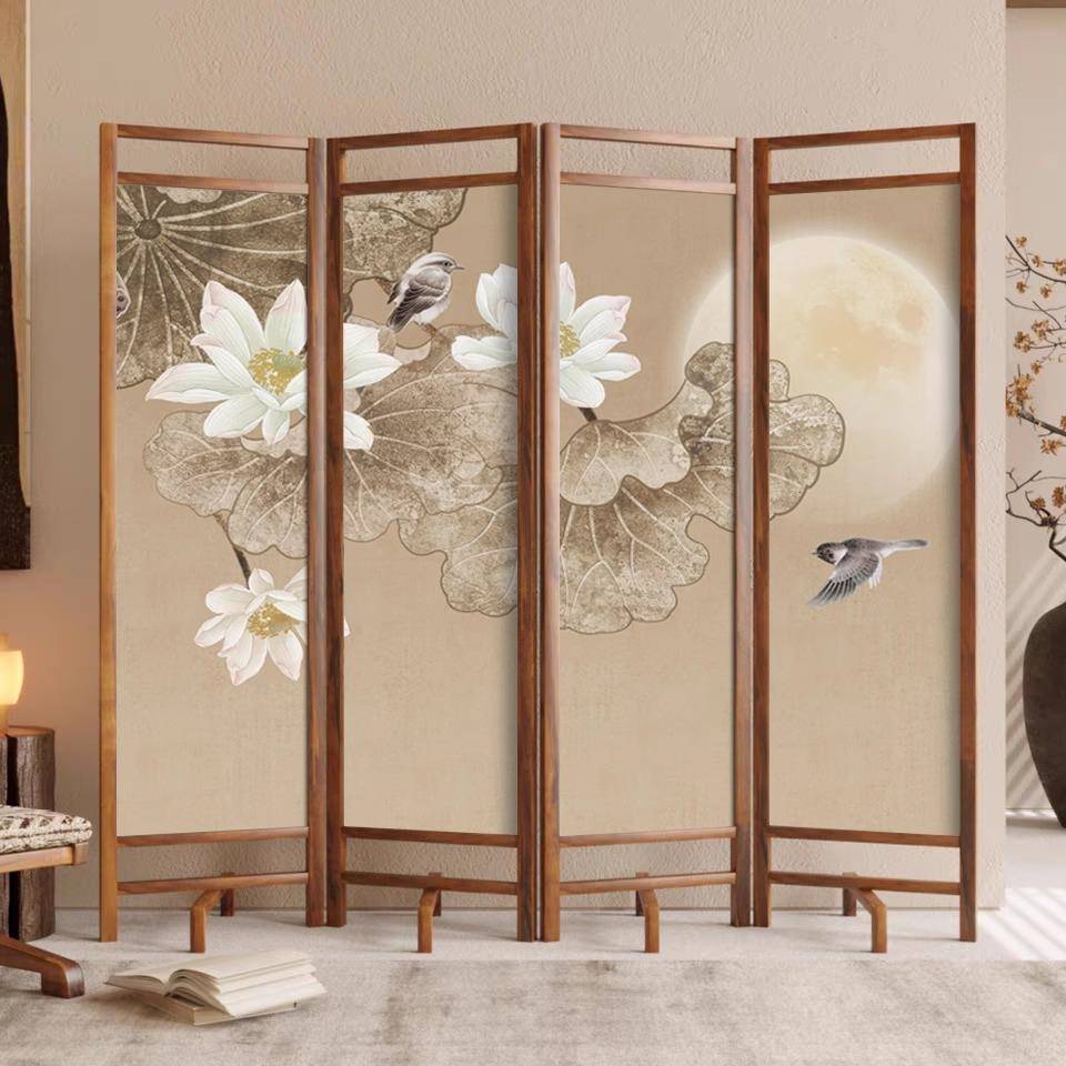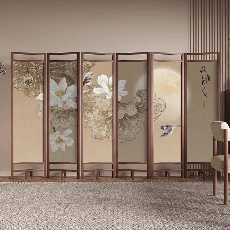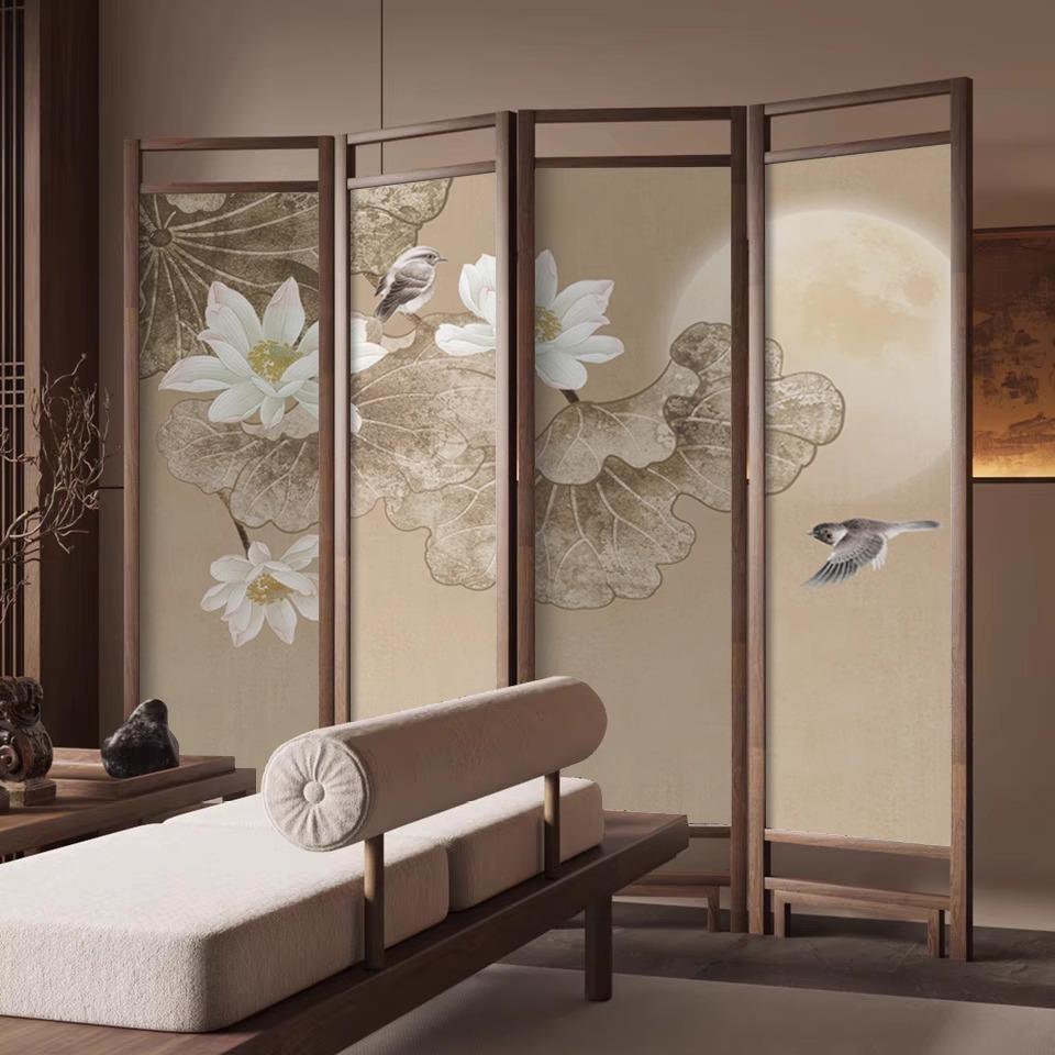 新中式实木屏风隔断客厅入户遮挡办公室酒店可折叠移动屏荷塘月色