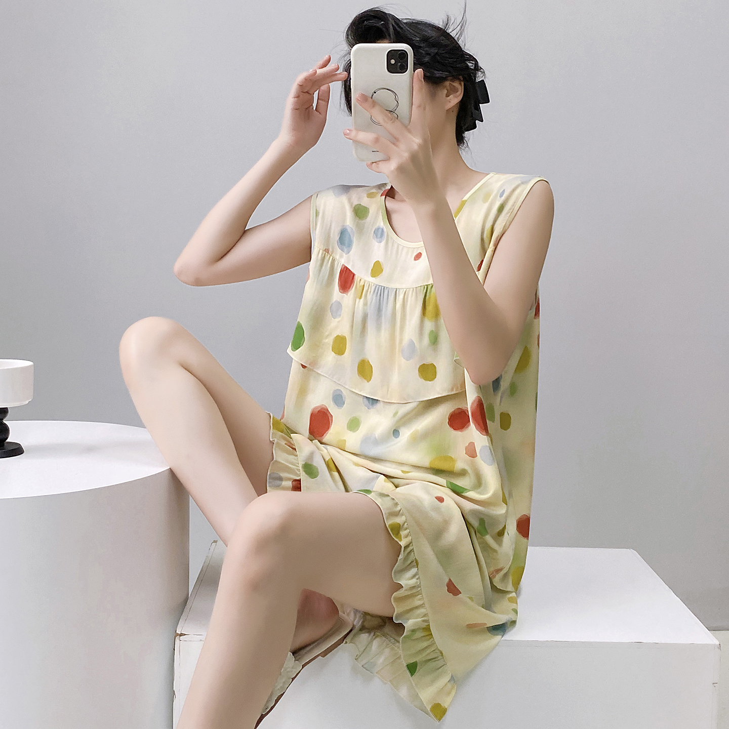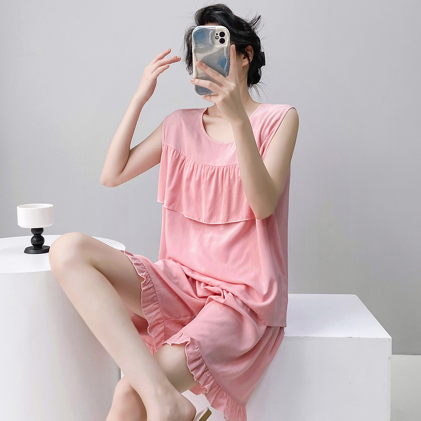 棉绸睡衣女夏季薄款防凸点无袖短裤甜美套装人造棉大码外穿家居服