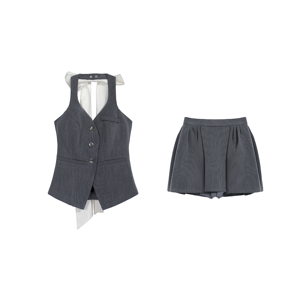 2025春夏季新款蝴蝶结西装马甲挂脖百褶短裙显瘦小众半身裙女套装