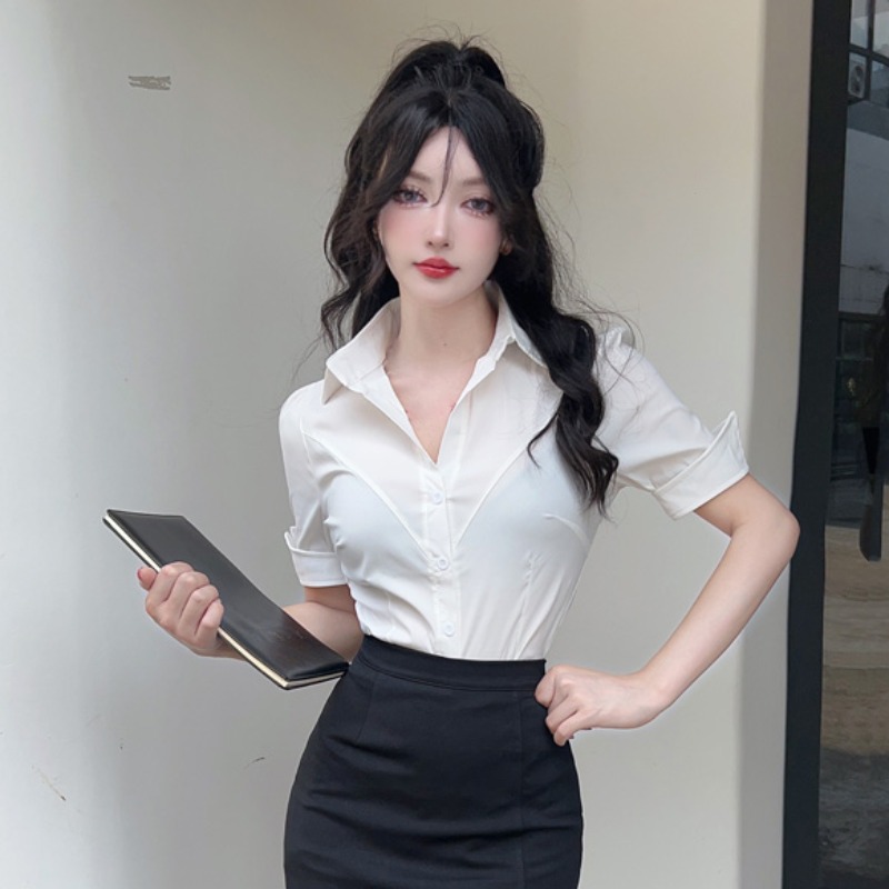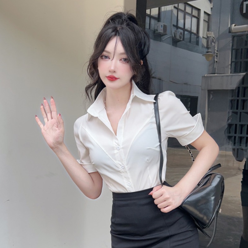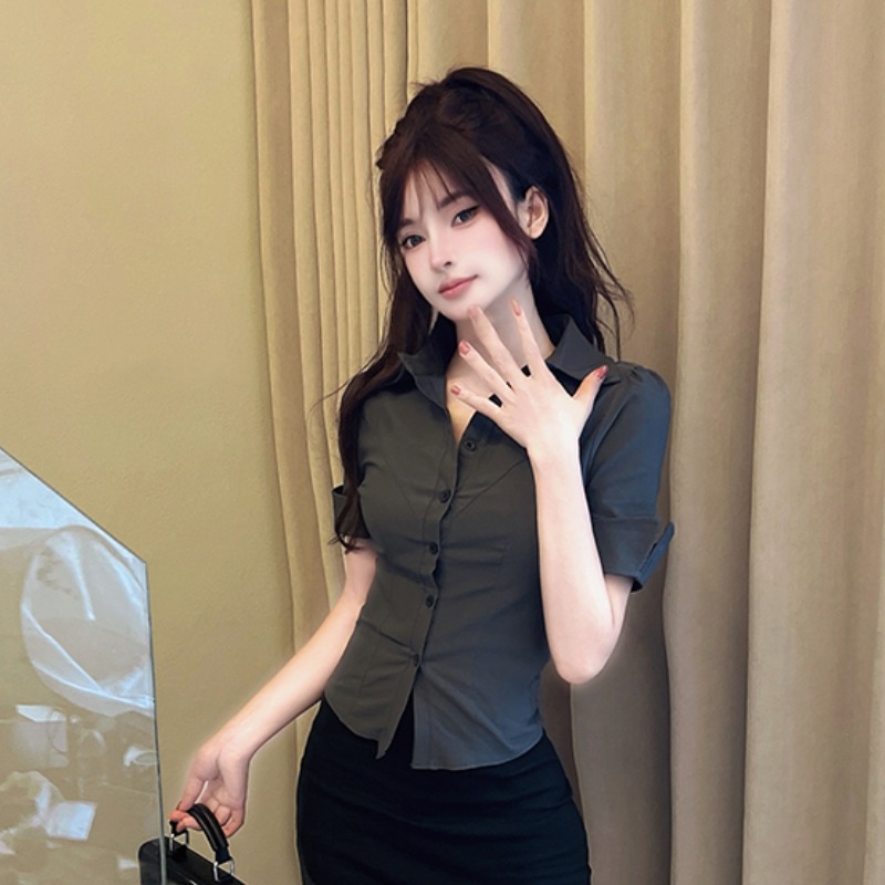 夏季灰色短袖衬衫女职业装修身性感御姐OL制服工作服气质衬衣上衣