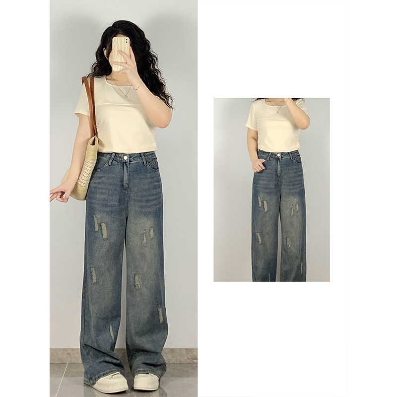 大码女装胖mm蓝色高腰破洞牛仔裤女宽松直筒洋气百搭女装阔腿裤子