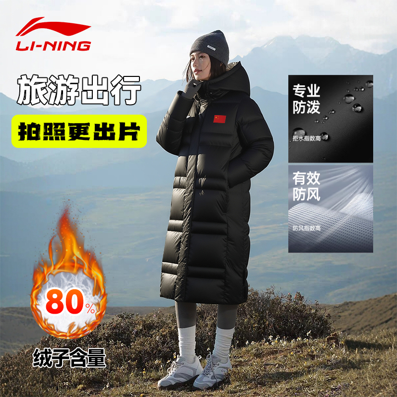 李宁乒乓球系列舒适简约百搭长款连帽运动字母羽绒服女款黑色