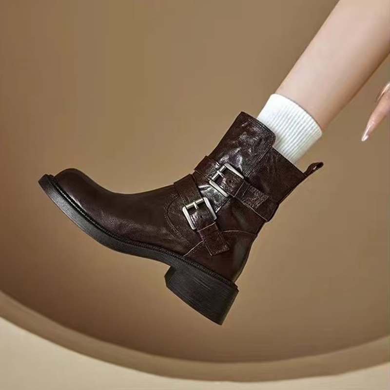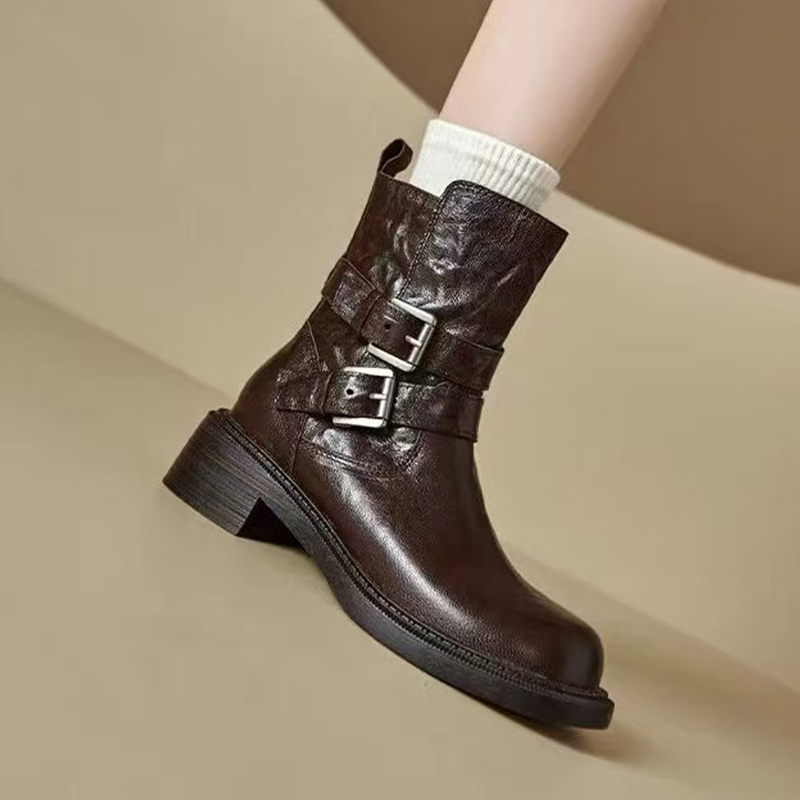 废土风复古手抓纹粗跟短筒马丁靴女超酷飒爽皮带扣平底圆头骑士靴