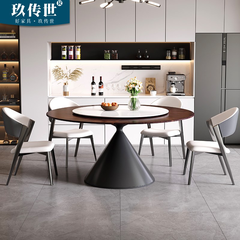 法式复古实木圆形餐桌椅组合美式中古风家用带转盘饭桌实木圆餐桌