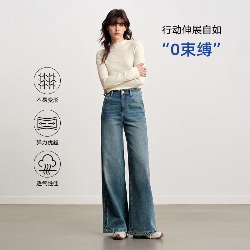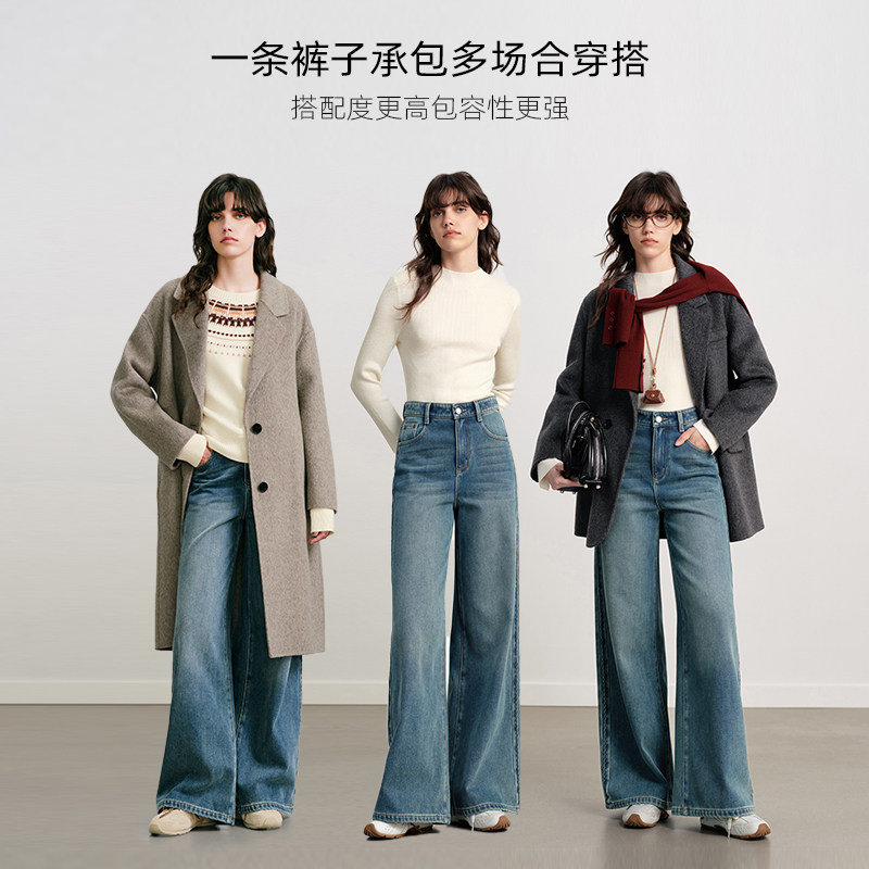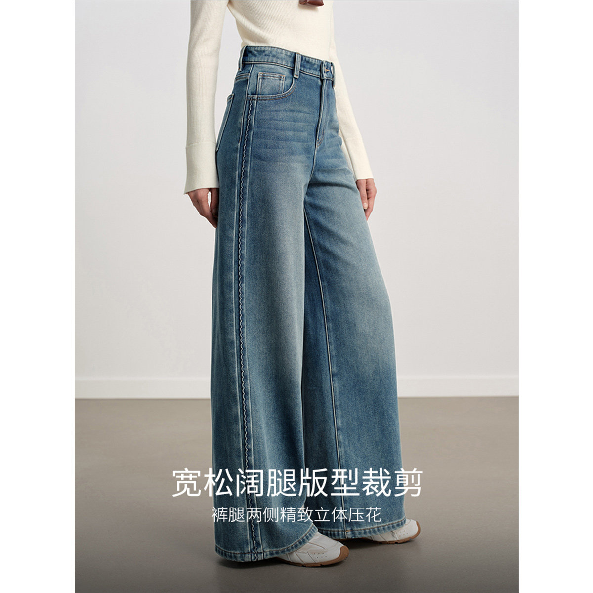 KBNE立体压花拉毛阔腿牛仔裤女2025秋冬季新款宽松直筒裤拖地裤子